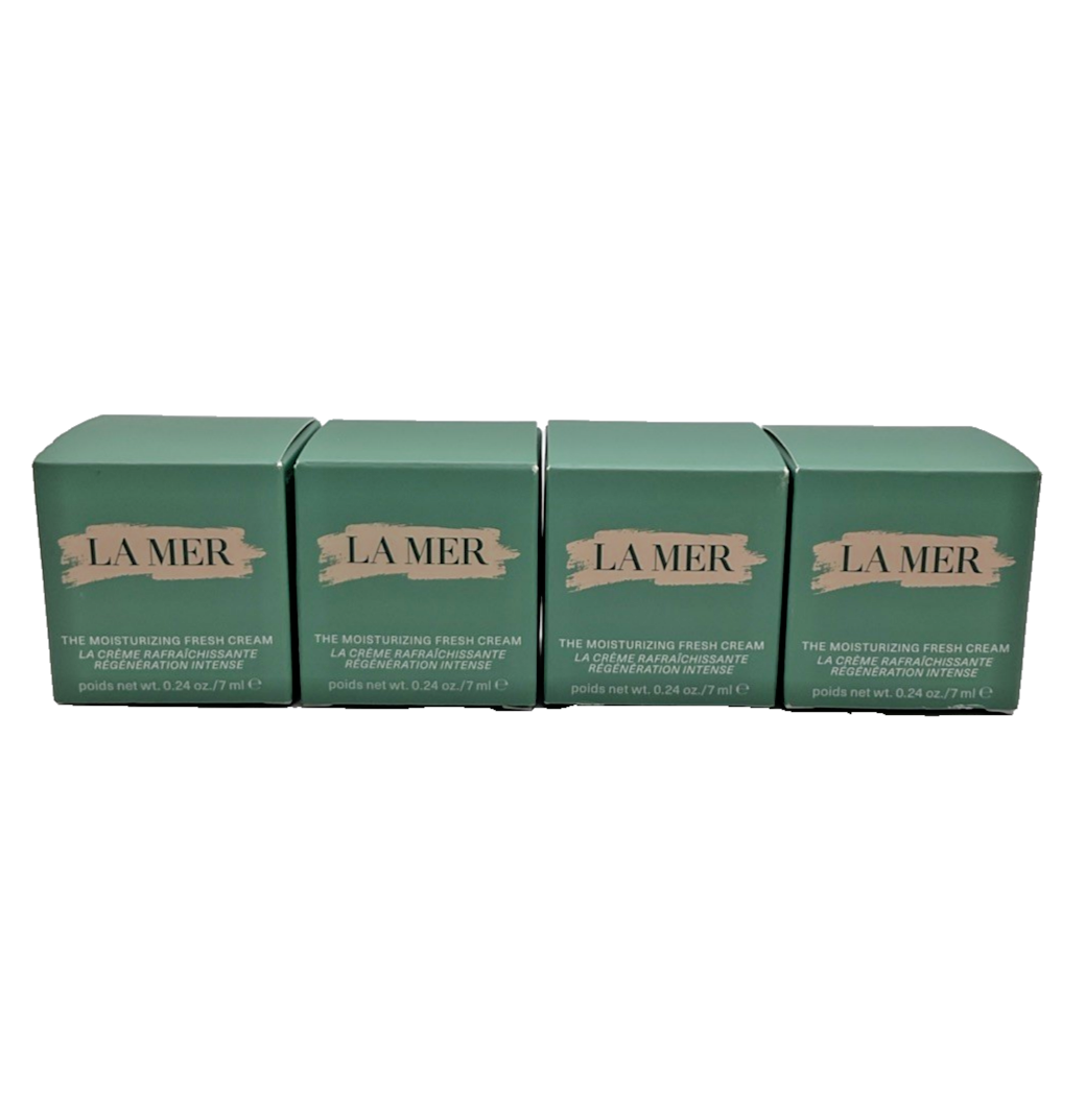 Brand New in Box La Mer The Moisturizing Fresh Cream Travel Size Skincare Set This set comes with four boxes of the La Mer The Moisturizing Fresh Cream. Each container is 0.24oz / 7ml. A refreshing take on La Mer's signature healing moisture. The Moisturizing Fresh Cream renews skin's youthful bounce for a firmer feel. Fueled by Miracle Broth, our visible youth-regenerating elixir, transformed through a 50-year legacy of bioenergetic science. In a feather-light texture ideal for oilier skin. All products are 100% authentic from our distributor and are stored in a climate controlled, pet-free, smoke-free environment. Please ask questions before purchasing as we do not accept returns for makeup or personal hygiene products.