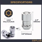Vintage Part: Yes Size: M12x1.5 Placement on Vehicle: Front, Left, Rear, Right Finish: Electroplating Iron, Rust Preventative, Zinc Plated Performance Part: Yes Items Included: Key, Wheel Lock Universal Fitment: Yes Thread Size: M12x1.5 Lug Nuts Seat Type: 60 Degree Cone Seat Lug Nuts Overall Tallness: 1.4"(36mm) Features: Durable, Easy Installation, Rust-resistant Coating Color: Silver Number in Pack: 4 + Key Brand: ESAccessories Type: Wheel Lock Lug Nuts Overall Diameter: 0.9"(23mm) Lug Nut Thread Depth: 1.3"(33mm) Material: Steel
