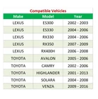 4pc: Front and Rear Stabilizer / Sway Bar End Links Fits Driver and Passenger Sides Kit Includes: 2x Front Stabilizer / Sway Bar End Link - K90344 2x Rear Stabilizer / Sway Bar End Link - K90345 FITS: MAKE MODEL YEAR RANGE SPECIFIC DETAILS LEXUS ES300 2002 - 2003 All Models LEXUS ES330 2004 - 2006 All Models LEXUS RX330 2004 - 2006 All Models LEXUS RX350 2007 - 2009 All Models LEXUS RX400H 2006 - 2008 All Models TOYOTA AVALON 2005 - 2006 Built After 2/06 TOYOTA CAMRY 2002 - 2006 All Models TOYOTA HIGHLANDER 2001 - 2013 All Models TOYOTA SOLARA 2004 - 2008 All Models TOYOTA VENZA 2009 - 2016 All Models