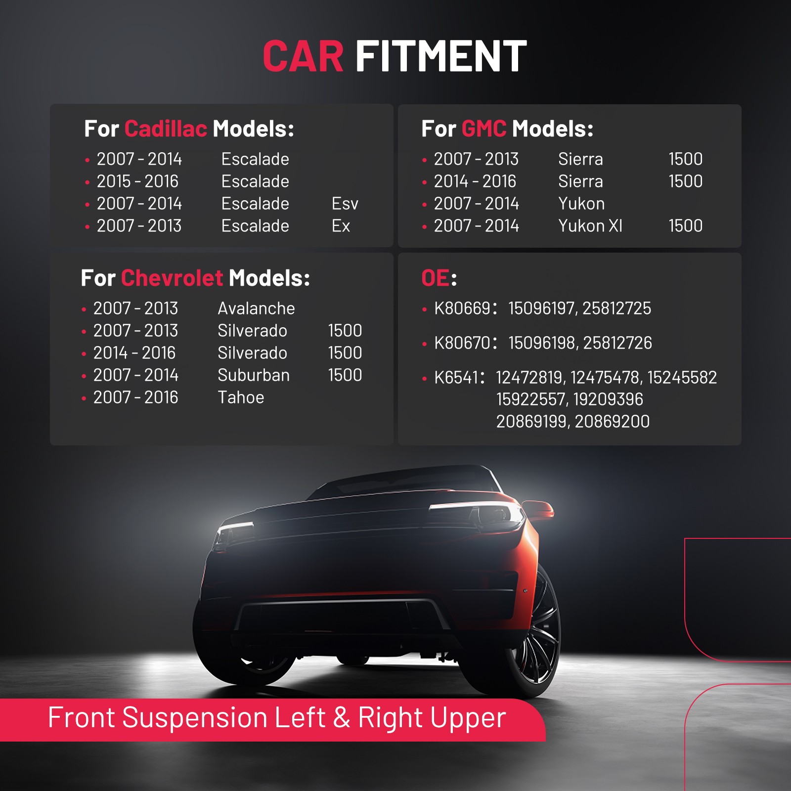 Compatibility: Front Upper Control Arm w/ Lower Ball Joints fit for 2007-2014 Cadillac Escalade, 2007-2015 Silverado 1500, 2007-2014 Suburban 1500, 2007-2013 Avalanche, 2007-2016 Tahoe; 2007-2015 GMC Sierra 1500, 2007-2014 GMC Yukon/ Yukon XL 1500 Replace Part Number: K80669, K80670, K6541. Placement on Vehicle: Front Upper/Lower Driver & Passenger Side Easy Installation: Quick and simple installation. Mounting Hardware included. Just install or remove it Premium Quality: Durable Front Upper Control Arm & Lower Ball Joint Kit is made with high strength steel tubing with solid plate mounting brackets for superior strength and durability. Heat treated to match or exceed OE requirements to inhibit premature failure and improve fatigue strength 4pcs Front Upper Control Arms w/Ball Joints for Tahoe GMC Sierra Yukon / XL 1500 4pc Front Upper Control Arm + Ball Joint Suspension Kit Fits Both Driver and Passenger Sides Kit Includes: 1x Front Upper Left Control Arm w/ Ball Joint - K80669 1x Front Upper Right Control Arm w/ Ball Joint - K80670 2x Front Lower Ball Joints - K6541 **Lower Ball Joints Fit STEEL Control Arms ONLY** FITS MAKE MODEL YEAR RANGE SPECIFIC DETAILS CADILLAC ESCALADE 2007 - 2014 Lower Ball Joints fit Steel Control Arms CADILLAC ESCALADE 2015 - 2016 Models with Police Package; Lower Ball Joints fit Steel Control Arms CADILLAC ESCALADE ESV 2007 - 2014 Lower Ball Joints fit Steel Control Arms CADILLAC ESCALADE EXT 2007 - 2013 Lower Ball Joints fit Steel Control Arms CHEVROLET AVALANCHE 2007 - 2013 Lower Ball Joints fit Steel Control Arms CHEVROLET SILVERADO 1500 2007 - 2013 Lower Ball Joints fit Steel Control Arms, Excludes Classic Models CHEVROLET SILVERADO 1500 2014 - 2016 Lower Ball Joints fit Steel Control Arms, Excludes Classic Models; Models with Cast Iron Control Arms CHEVROLET SUBURBAN 1500 2007 - 2014 Lower Ball Joints fit Steel Control Arms CHEVROLET TAHOE 2007 - 2016 Lower Ball Joints fit Steel Control Arms GMC SIERRA 1500 2007 - 2013 Lower Ball Joints fit Steel Control Arms Excludes Classic Models GMC SIERRA 1500 2014 - 2016 Lower Ball Joints fit Steel Control Arms Excludes Classic Models; Models with Cast Iron Control Arms GMC YUKON 2007 - 2014 Lower Ball Joints fit Steel Control Arms GMC YUKON XL 1500 2007 - 2014 Lower Ball Joints fit Steel Control Arms Payment Delivery details Terms of sales About us Contact us Payment 1.We only accept PayPal. PayPal is the only online payment method we accept. Please make sure you have a valid/confirmed PayPal account prior bidding. 2.All Paypal Payments must be Confirmed. Payment must be made within 48hrs of the auction end time. Non-Paying bidders will be reported. 3.When you get your package,maybe you will pay some charges, it's taxes for local customs,not pay to us, and the fees are depends on the customs, all buyer are same. Delivery details 1.Items will be shipped within 2 business days after payment is received. 2.We ship to your eBay address. Please make sure your eBay address is correct. Buyer takes responsibility if eBay address is wrong. 3.Import duties, taxes and charges are not included in the item price or shipping charges. Please check with your country customs office for these additional charges. 4.We shipping using UPS or USPS from our nearest warehouse to you. Tracking numbers will be emailed upon shipment. Terms of sales 1.Please feel free to email us if you have any question. 2.We appreciate you contact us via eBay message when you are not satisfied rather than open case or leave negative feedback directly. We'll try our best to solve the issue. 3.Refund will be issued once we receive your returned items. Buyer is responsible for all return shipping charges. 4.Please contact us for return process before you return the item. 5.All items for exchange or refund must be returned in "as new" condition. About us We are the responsible seller ,always provide high-quality products and best service .If you have any questions, please contact us, and will try our best to help you. Please contact us by eBay Message, and we will reply you within 24 hours. Thank you very much! Contact us We are the professional auto parts manufacturer , and provide line lock, AN hose end fittings , fuel line , fuel filter , fuel regulator , exhaust cutout , exhaust tips , exhaust muffler and so on .The quality of the product to be secured. If you have any questions or any needs , please contact us , and will try our best to help you.