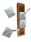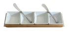 Add a touch of elegance to your dining table with this 4-piece condiment set. The set includes four serving square bowls and one bamboo serving tray. The square shape of the bowls and rectangular tray along with two small butter knives make them a perfect fit for any table setting. Crafted from high-quality glass and bamboo materials, this set is both durable and stylish. Use it to serve your favorite condiments and enhance your dining experience. Perfect for any occasion, this condiment set is a must-have addition to your kitchen collection. The pictures shown are the actual item you will receive. Please check photos carefully as they are the best description.