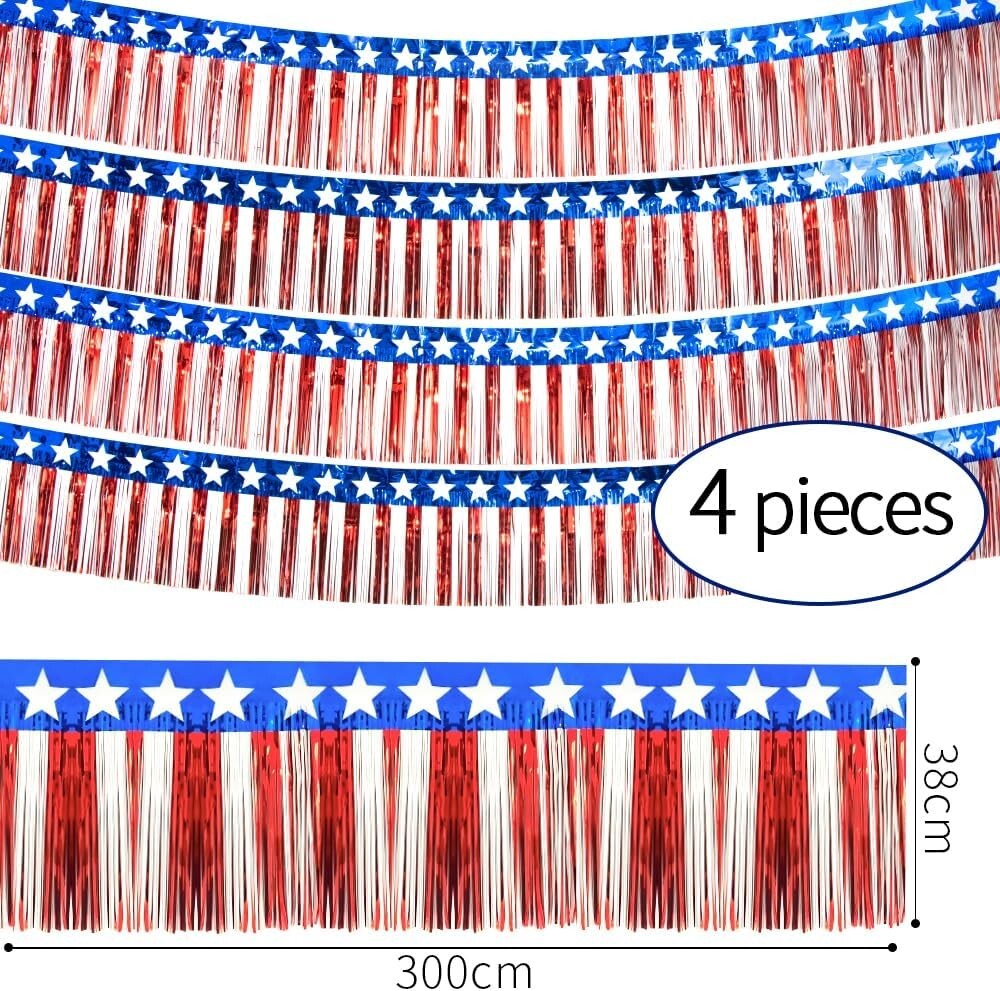4th of July Decorations 4 Pack 40Ft Tinsel Foil Fringe Garland Streamers Hanging Red White Blue Fringe Backdrop Banner for Parade Floats Decor 4th of July America Patriotic Day Memorial Day About this item 4th of July Decorations 4 of July Independence Day Decor 4 Pack Total 40 Feet Tinsel Foil Fringe Garland Curtains Streamers Banner Wall Hanging Red White Blue Metallic Tinsel Fringe Garland Backdrop Banner for Party Decoration Parade Floats Decorations 4 of July Independence Day America Patriotic Day Memorial Day Labor Day Decor Package Include: The package contains 4 packs of tinsel foil fringe garland streamer banners ( 15 inch width and 10 feet length for each pack, totally 40 feet length) which is long enough for your decoration plan. Festival Customization Unique and Beautiful: This red, white and blue foil fringe garland decoration with the classic colors of the American flag as the theme, with the flowing rain effect, to create a unique and charming visual effect. When decorating places such as walls, doors, Windows or balconies, it can attract the eye and add a festive atmosphere. This decoration is especially suitable for the United States Independence Day and other related holidays, such as National Day, Memorial Day, America Patriotic Day, Labor Day etc. Choosing the classic colors of red, white and blue symbolizes patriotism and free will, and can convey the festive and grand sense to people. Easy to Install: Our red, white and blue tinsel foil fringe garland decoration is designed to be simple and easy to install, and can be easily hung on walls, doors and Windows or other suitable locations. Built-in double-sided tape, easy and convenient to paste. It does not require complex tools or professional skills, and it is convenient for consumers to decorate themselves