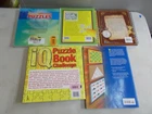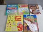 This lot of books includes: Brain Games Kids - spiral bound, one page completed Brain Games: Sherlock Holmes Puzzles - spiral bound One-Minute Puzzles - writing on one page Number Enigmas Puzzle Book Challenge - first six pages are a little fluffy outside edge of page We purchase our books for resale so most of them will have old price stickers on the back cover. We do our best to give an honest description of any damage to the books, but what we sell are used books and we have no idea the history of the books. When we list a set of books they are boxed and sent to our warehouse to await sale and shipment. It is not cost effective for us to bring them back to our office and sell just part of a set.