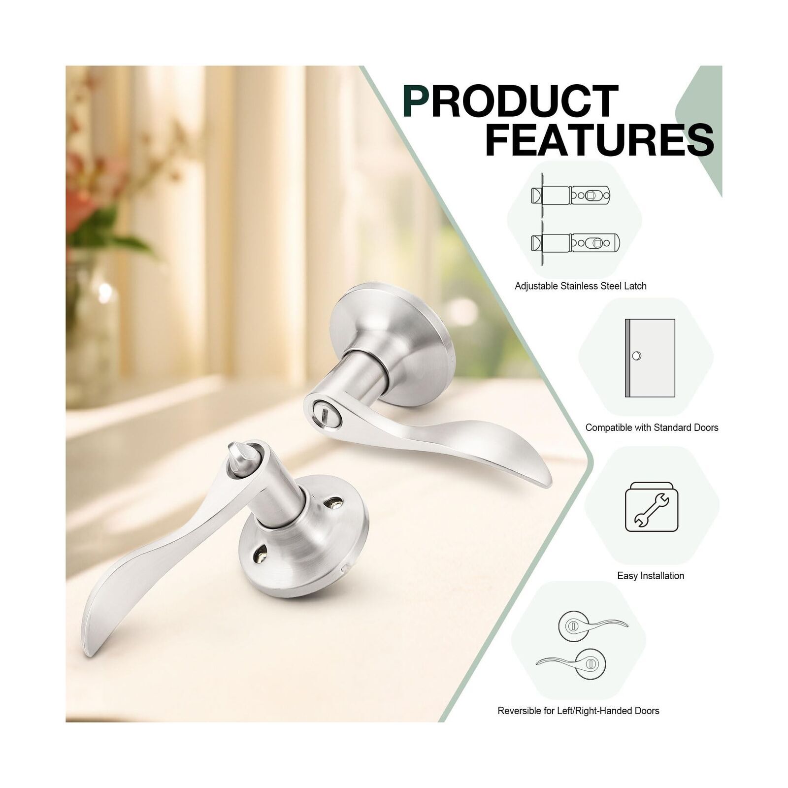 5 Pack Brushed Nickel Privacy Door Handles (keyless) Description Features: Brushed Nickel Privacy Door Handles-for Bedroom Bathroom Privacy Door Lever (keyless): Privacy door handles interior are ideal for bedroom, bathroom, or any room where privacy is essential. Locked inside with a thumb-turn and opened outside with a coin for emergency release. Modern Design: Brushed nickel interior door handle boasts a sleek and simple design that blends into any modern decor. Crafted from premium stainless steel and zinc alloy, sturdy and durable. Fit Standard-sized Doors: Nickel door handle with lock is designed to fit standard-sized doors with a door thickness ranging from 35mm to 45mm(1-3/8" to 1-3/4"). It can be used on both left-handed and right-handed doors. Dimensions: Rosette Diameter: 2-3/5"(65mm); Handle Length: 4-7/10"(120mm); Adjustable Latch: 2-3/8" or 2-3/4" (60 or 70mm) backset. Easy Installation: Comes with installation instruction and all necessary mounting hardware. All you need is a door and a philips screwdriver. Product Details: Material: Metal Color: Satin Nickel Product Dimensions: 10"L x 2"W Exterior Finish: Nickel Material: Metal Color: Satin Nickel Product Dimensions: 10"L x 2"W Exterior Finish: Nickel Specific Uses For Product: Commercial/Residential Special Feature: Easy to Install Included Components: Door levers, necessary fitting components and installation instruction Lock Type: Keyless Lock Item Weight: 7.4 Pounds Metal Type: Zinc Alloy, Bronze Handle Material: Metal Hand Orientation: Ambidextrous Package Type: Standard Packaging Unit Count: 5.0 Count Number of Items: 5 Room Type: Bedroom, Bathroom Indoor/Outdoor Usage: Indoor Part Number: US10-DL3682XSNBK-5Pack Item Weight: 7.4 pounds Item model number: US10-DL3682XSNBK-5Pack Size: Privacy Door Lever - Keyless Finish: Nickel Pattern: Wave Style Door Lever Item Package Quantity: 5 Number Of Pieces: 5 Special Features: Easy to Install Batteries Required?: No Date First Available: October 13, 2020 Delivery We Do Not Ship Outside of the Continental US. Return Policy All items qualify for returns within 30 days of receipt. Buyer is responsible for return shipping on any item that is not damaged. Feedback We take our reputation seriously, we buy and sell online, so we understand the value of trust. If you are unsatisfied with your order, please contact us and we will work with you to resolve it to your satisfaction.