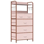 Wooden Storage Tower Chest of Drawers with 5 Drawers Storage & 4 Hooks, 47.2" Tall Dresser Organizer Unit Closet with 2 Open Shelves, Fabric Dressers for Bedroom, Living Room Furniture-Grey/Brown/Pink 【 5 Closet Storage Drawers of 2 Sizes 】: This closet drawer organizer is featured with 5 drawers, perfect for organizing clothes, toys, socks, underwear, scarves, blankets and other accessories. 3 large ones measured of 22 x 11 x 7.8 inches each, 2 medium drawers measured of 10.6 x 10.6 x 7.8 inches each. Clothes drawer design purpose is to keep your cloths away from dust, dots or other pollution. This closet organizer bins not only act role on storing clothes, but also protect your health. 【 2 Open Shelves with Side Panels Design 】: This dresser organizer are measured of 23.6 x 11.8 inches, which is wide enough to store things. Top can display vases, photo frames, lamps etc decorations, the second one can place glasses, alarm clocks, books, chargers and other sundries etc ordinary things. This open shelves design is convenient and practical, also artistic as a decor with drawer unit. This storage chest for bedroom side panel can perfectly prevent things from falling and keep safe. 【 4 Hooks Cloth Dresser 】: Besides the closet drawers for clothes, this organizer also designed with 4 side S hooks, which is easily movable and perfect for hanging hats, scarves, hairband, handbags, umbrellas or hurry bags. Anti-scratch treatment at the both end of the hooks make hanging fabric issues safe and avoids damage to your clothes or clothing things. You can also store these hooks in the drawers if you do not need them. Very flexible and convenient details design. 【 Sturdy Anti-tip Kit & Adjustable Feet Structure 】: The chest of drawer is made with sturdy metal frame, and its back is equipped with more reinforced crossbar, which offers high strength support and ensure years of use. Anti-toppling device is provided to prevent it from falling down. Height adjustable feet makes it more easy to keep balance and prevent wooden floor from scratches. These all enable our bedroom closet to bear a large capacity clothes and good bearing. 【 Safe Non-woven Fabric & MDF Materials 】: The wooden drawer chest is made of solid and wear-resistant MDF and healthy non-woven fabric. With high quality breathable non-woven synthetic fabric as surface layers, MDF board as middle layer, our fabric drawer organizer of special 3-layer structure design is more durable, flat and not easily deformed compared others only fabric layer. Additionally, our whole dresser organizer for bedroom material has been tested, you can have no worry to store clothes 【 Easy to Assemble & Cleaning 】:The package includes all the tools and accessories, you can install it in 20 minutes with the instruction. The wood dresser is slim and light, and does not take up much space. Perfect Gift for a housewarming or your family and friends. Overall dimension: 23.6"D x11.8"W x 47.2"H. And it is easy to do the maintenance, wipe with a damp cloth and let air dry.
