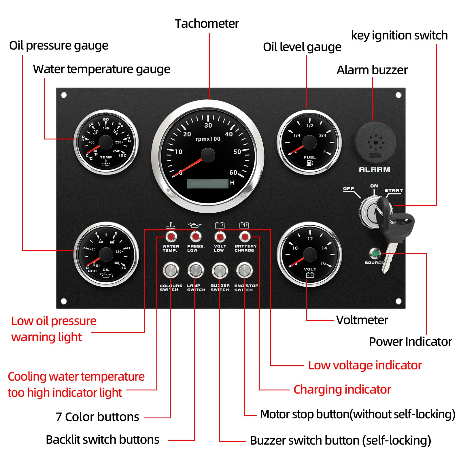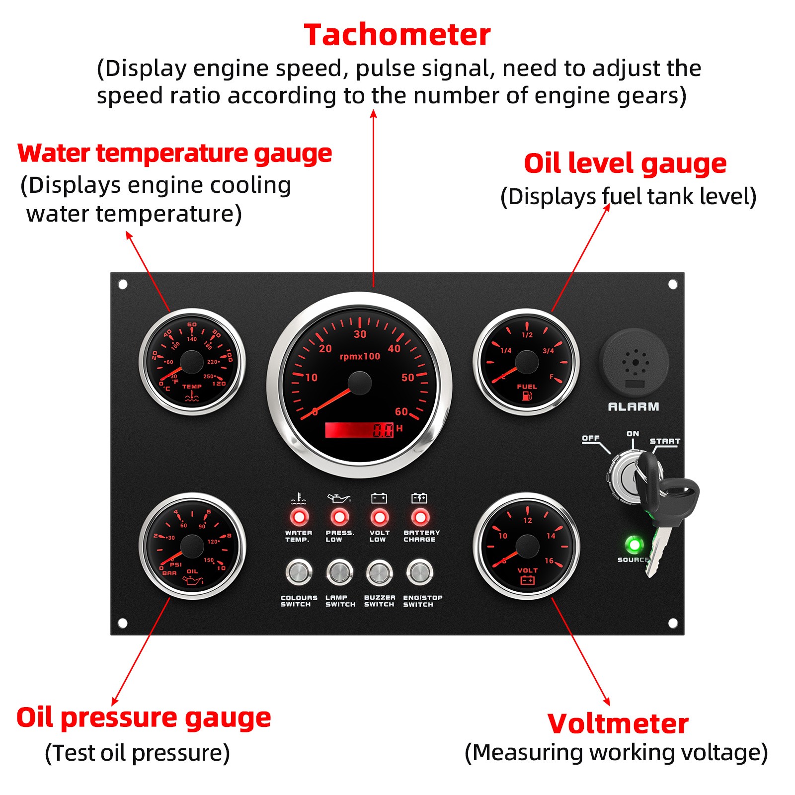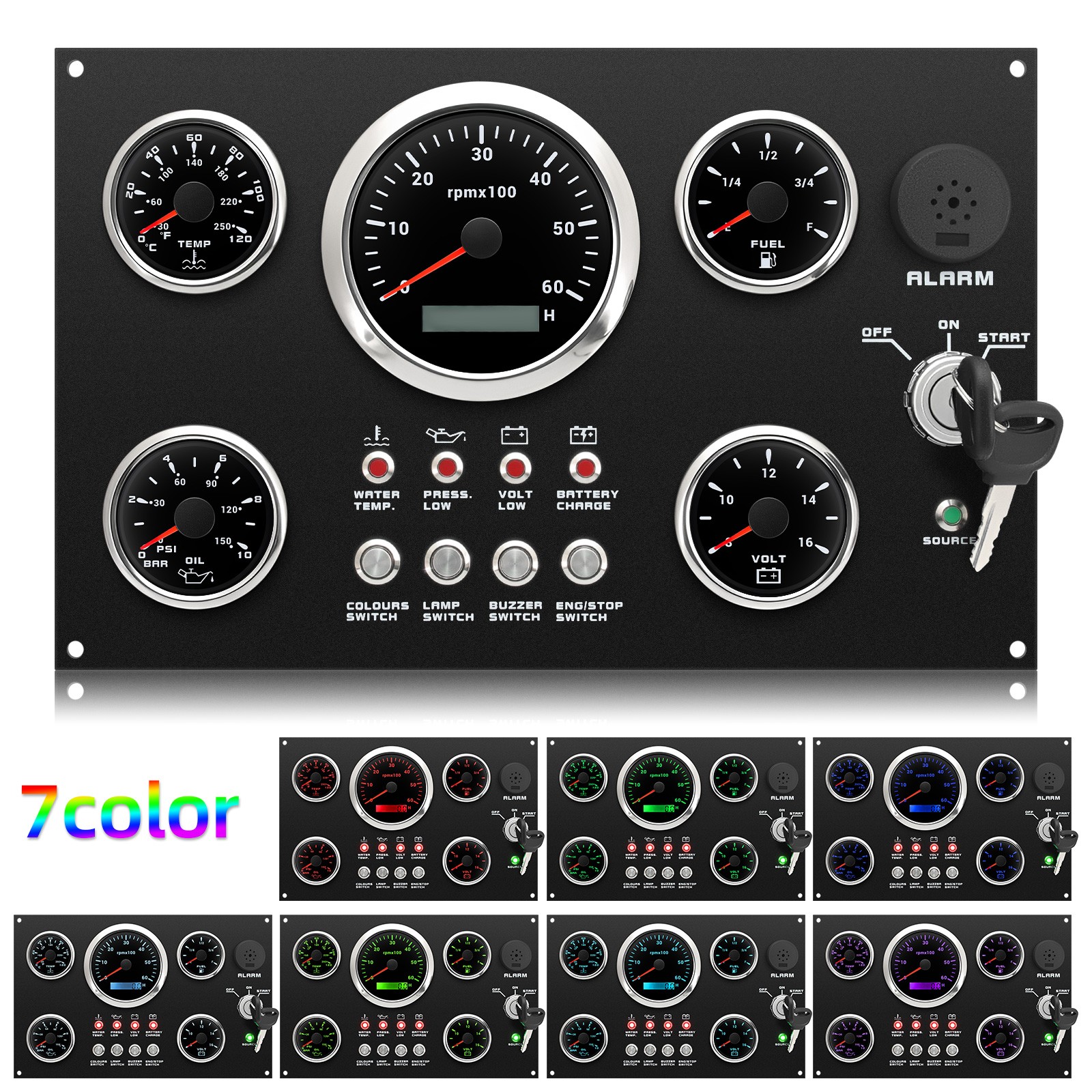 5 Gauge Set with Instrument Panel 0-6000 RPM Tachometer For Marine Boat Yacht 5 Gauge Set with Instrument Panel 0-6000 RPM 7Colors LED For Marine Boat Yacht Feature: Analog Display Tachometer & Digital Display Hour Meter. Clear Lens, 316 Stainless Steel Bezel with ABS Plastic Housing. Black Faceplate, Red Needle with 7 colors LED Illumination. With IP67 Waterproof, Rustproof, Anti-Fog & UV-Resistant. Hour Meter Records to 99999.9 Hours & Automatic Roll Over Resolution 0.1 Hour. Volt Gauge, Fuel Level Gauge, Water Temperature Gauge & Oil Pressure Gauge with Warning Function. Gauge Set (Except Volt Gauge) Requires 12 / 24 Volt Negative Ground Systems. Volt Gauge Requires 12 Volt Negative Ground Systems. One Year Limited Warranty for Non-Human Factor Damage & Free Lifetime Technical Support. Tachometer Install Diameter: Φ85mm or 3-3/8" Engine hours: 0.0-99999.9H Backlight :7 Color backlight Indicating Range: 0~6000RPM Signal: Pulse For Tachometer, you can substitute for different unit, please contact us before / after purchase or note on the order. Tachometer: 0-4000rpm/0-3000RPM/7000RPM/8000RPM Fuel Level Gauge Sizes: 52 mm (2-1/16") Measuring Range: Empty - Full Resistance: 240 (E) - 33 (F) ohms Backlight: 7 Colors Water Temperature Gauge Install diameter: Φ52mm Indication range: 0~120℃/30-250℉ Input signal: 287.4~22.4 ohms Storage temperature: -40~+85℃ Backlight: 7 Colors Oil Pressure Gauge Install diameter:Φ52mm or 2-1/16" Indication range:0~10bar / 0-150 PSI Operating temperature:-30~+75℃ Storage temperature:-40~+85℃ Backlight: 7 Colors Volt Gauge Sizes: 52 mm (2-1/16") Measuring Range: 8 - 16 (V) Backlight: 7 Colors PACKAGED 1x Tachometer 1x Water Temperature Gauge 1x Oil Pressure Gauge 1x Fuel Level Gauge 1x Voltmeter 1x Fuel level sensor 1x Tacho sensor 1x 1/8NPT Water temp sensor 1x 1/8NPT Oil pressure sensor 5x Wire Harness 1x Instrument Panel 1xInstallation Manual