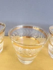 Set Of 5 beautiful elegant somewhat delicate drinking glasses. Each one features an etched design and a double gold band. Thick glass bottom. Great for use in the bar or dining room. Great condition, but not perfect. Please examine pictures carefully prior to purchase and ask questions if you have any
