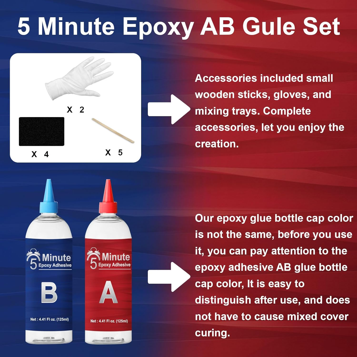 5 Minute Epoxy Glue 8.8Oz Tough Durable Clear Epoxi Adhesives Fast Repair 2 Part 5 Min Epoxy: 2 Part epoxy glue enjoy the flexibility of approximately 5 minutes of working time, Provide you with enough time to adjust your work creation. Functional curing in one hour, full curing in 24 hours High Temperature Resistance: Our 5 minute epoxy clear has a high temperature resistant effect and is able to withstand temperatures up to about 300 degrees Fahrenheit (about 149 degrees celsius). Note: The higher the temperature and humidity, the lower the working time will be. The lower the temperature and humidity, the lower the working time will be Versatility: This fast curing epoxy adhesive resin is compatible with Metal, glass, wood, concrete, tiles, ceramics, porcelain, 3D printed parts, fiberglass, fabrics and most plastics make it a versatile clear epoxy glue of choice Set Includes: Set contains epoxy resin glue*2, small wooden stick*5, gloves*2 and mixing trays*4. Use the epoxy glue all purpose to mix and stir 1:1 on the mixing trays and say goodbye to complicated operations Two-Color Bottle Cap: Our epoxy glue clear does not need to be cut, just unscrew the cap and use it. The caps of our two part epoxy glue bottles are different in color. Before use, you can pay attention to the color of the epoxy glue bottle caps to avoid cross-mixing and curing Product Description Item model number USGK-1033 Compatible Material function(f) {var _np=(window.P._namespace("DetailPageProductOverviewTemplatesJava"));if(_np.guardFatal){_np.guardFatal(f)(_np);}else{f(_np);}}(function(P) { P.when('A').execute(function(A){ A.on('a:truncate:po-attribute-truncate-3:updated', function(data) { var isTruncated = !data.truncateInstance.getIfTextFits(); var seeMoreElement = document.getElementById('po-attribute-see-more-id-3'); if(seeMoreElement) { seeMoreElement.style.display = isTruncated ? '' : 'none'; } }) }); })); Metal, Glass, Wood, Concrete, Tiles, Ceramics, Porcelain, 3d Printed Parts, Fiberglass, Fabrics, Most Plastics See more Material Epoxy Resin Country of Origin China Specific Uses For Product Home Repair, DIY Projects, Arts and Crafts Production Item Form Liquid Package Dimensions 6.57 x 3.19 x 1.69 inches; 7.05 ounces Complimentary Shipping and Easy Returns Need to return something? Enjoy our 30-day hassle-free return policy! Take advantage of free shipping across all 48 contiguous states! Your order will be dispatched within 1-2 business days once payment is confirmed. Your Opinion Matters! Your happiness is our main goal! We welcome your feedback! If you encounter any problems, reach out to us right away, and we’ll be here to help. Explore the Extraordinary! Our collection showcases fascinating products that are sure to capture your attention. What surprises await you? Delve in and discover unique items that enrich your daily life. Don't miss the amazing things we have in store for you!