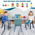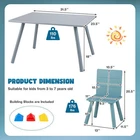 Specifications: Color: Grey Blue Material: MDF Solid wood leg Overall dimension of table: 31.5" x 23.5" x 18" (L x W x H) Overall dimension of each chair: 13" x 11.5" x 20.5" (L x W x H) Seat height from the ground: 10" Total net weight: 34 lbs Weight capacity of table: 110 lbs Weight capacity of each chair: 176 lbs Recommended age: 3 - 7 Years old Package includes: 1 x Table 4 x Chairs 1 x Set of building block 1 x Instruction -Thickened MDF for longer service time -Solid wood legs with anti-slip foot pads for strong stability -Safe to use with ASTM and CPSIA certifications -Round edge design for additional safety -Large tabletop for playtime homework and mealtime -Promote kid's creative thinking and hands-on ability with included building blocks -Helps to form correct sitting posture with ergonomic chairs -Chairs can be stacked on the tabletop or stored under the tabletop for space-saving -Ideal gift for kids from 3 to 7 years old -Suitable for playroom kid's room and living room etc -Waterproof surface for easy cleaning -Convenient to install with detailed instruction