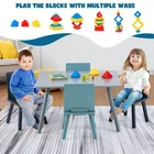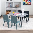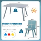 Specifications: Color: Grey Blue Material: MDF Solid wood leg Overall dimension of table: 31.5" x 23.5" x 18" (L x W x H) Overall dimension of each chair: 13" x 11.5" x 20.5" (L x W x H) Seat height from the ground: 10" Total net weight: 34 lbs Weight capacity of table: 110 lbs Weight capacity of each chair: 176 lbs Recommended age: 3 - 7 Years old Package includes: 1 x Table 4 x Chairs 1 x Set of building block 1 x Instruction -Thickened MDF for longer service time -Solid wood legs with anti-slip foot pads for strong stability -Safe to use with ASTM and CPSIA certifications -Round edge design for additional safety -Large tabletop for playtime homework and mealtime -Promote kid's creative thinking and hands-on ability with included building blocks -Helps to form correct sitting posture with ergonomic chairs -Chairs can be stacked on the tabletop or stored under the tabletop for space-saving -Ideal gift for kids from 3 to 7 years old -Suitable for playroom kid's room and living room etc -Waterproof surface for easy cleaning -Convenient to install with detailed instruction