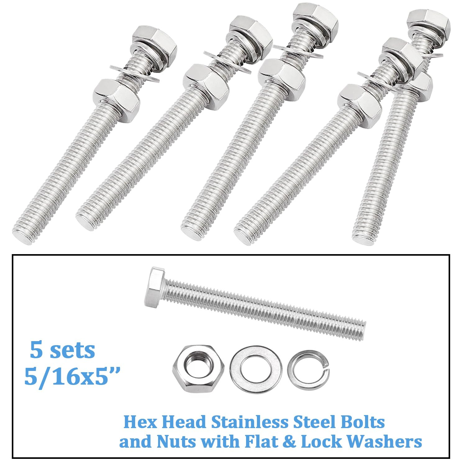 Hex head screws bolts is fully threaded and made of 18-8 stainless steel. Hexagon bolt is suitable for heavier fasteners and its size is larger than other fasteners. Hex head screws bolts package includes 5pcs--5/16 x5 bolts, 5pcs--5/16 hexagon nuts, 5pcs--5/16 flat washers and 5pcs--5/16 open locking washers, which are stored in plastic bags and are not easy to lose. Features: Hex head screws bolts have good corrosion resistance, firmness and can be used for a long time. Hex head screws bolts are widely used in agriculture, automobiles, construction and other applications, and hexagonal bolts are very suitable for use in wet and wood environments. Tips: Our products are fine in workmanship. If you have any problems when using them, please contact us in time and we will deal with them as soon as possible.