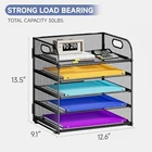 5 Tier Paper Organizer with Handle, Metal Mesh Desk File Black About this item: 【EFFICIENT DESK ORGANIZER】Keep your desk tidy and clutter-free with our 5-Tier Paper Organizer with Handle. This file organizer provides ample space for sorting and storing papers, letters, documents, folders, books, magzines, staplers, caculators and sticky notes. 【USER-FRIENDLY DESIGN】You could lift this file organizer easily with smooth handles. One corner of the desktop organizer is designed with a rounded edge for safety. Additionally, each folder organizer comes with anti-slip feet to keep stable when placing or picking up documents. 【DURABLE CONSTRUCTION】This desk file organizer is crafted from premium metal mesh. Thickened support rods and a sturdy frame ensure that the file organizer won't warp or break when holding a large volume of paper or letters. 【2 STEPS TO ASSEMBLE】The frame of the letter tray is connected by hinges. You only need to fix the top and bottom trays, and then place the middle trays in position. Each letter tray comes with a screwdriver and an installation instruction. It just takes minutes to assemble the document organizer. 【STYLISH OFFICE SUPPLIES】This paper tray is available in multiple colors to match different office styles. Not only the desk organizer tray save space for your workspace, but its stylish design makes your office look more professional.