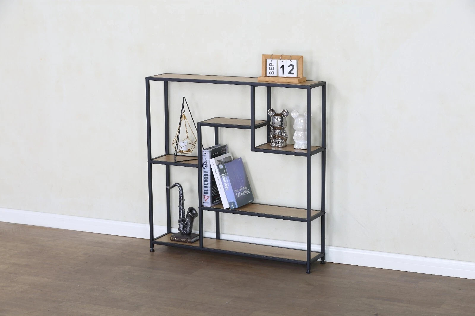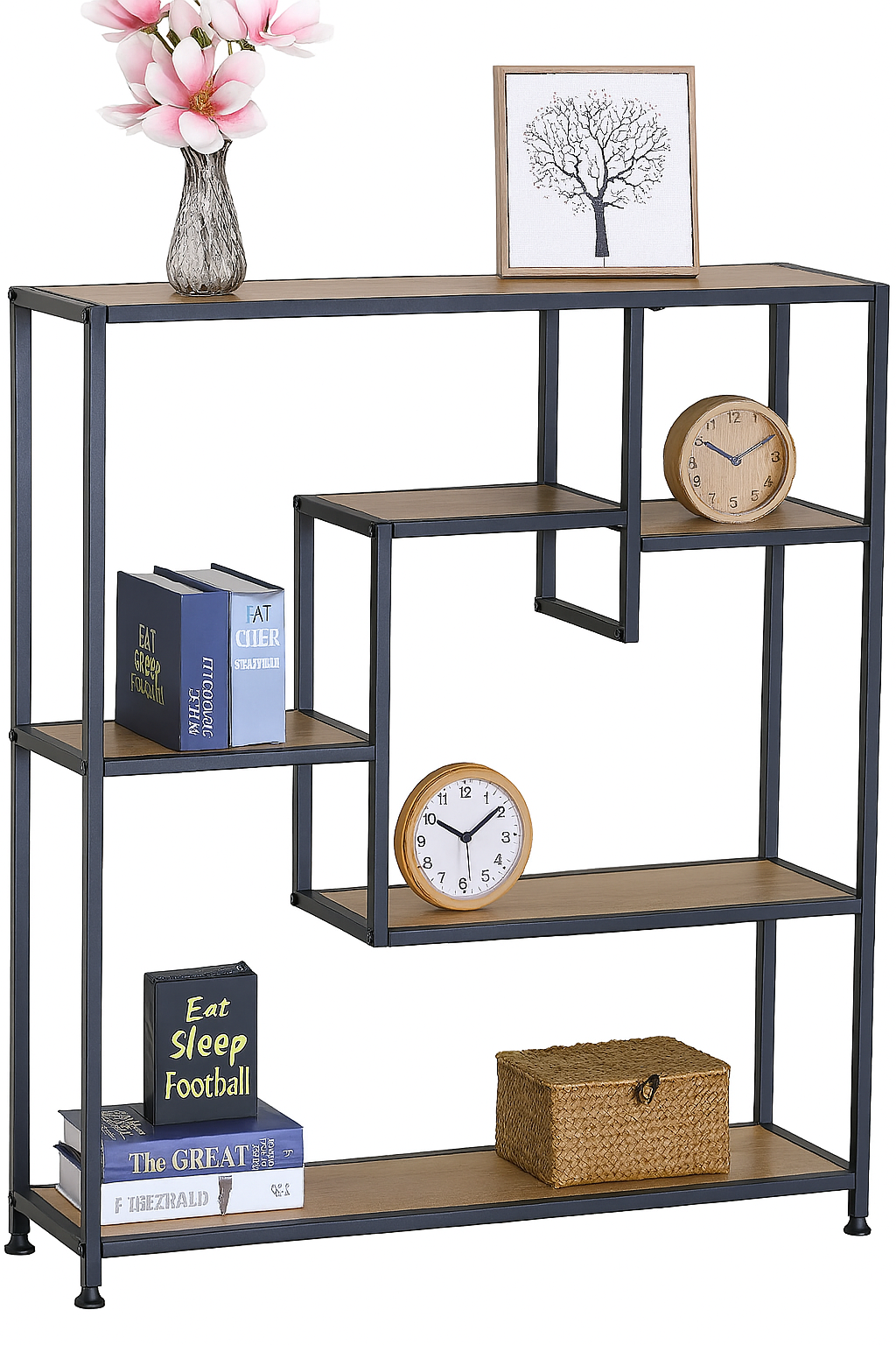 Modern 5 Tier Bookshelf – Display & Storage Unit for Home or Office Add contemporary style and smart storage to your space with this 5 Tier Display Shelf Unit . Measuring 85 x 18 x 85 cm , this compact yet striking bookcase is perfect for showcasing books, décor, plants, and more. Crafted from durable particle board with a melamine finish and a strong steel frame , the unit offers a blend of industrial charm and everyday practicality. Its open-back design and varied shelf layout bring a modern touch while keeping your space feeling open and organised. Whether used in the living room, bedroom, hallway, or home office , this shelving unit makes a functional and stylish addition to any modern interior. Features: Size: 85cm (W) x 18cm (D) x 85cm (H) Materials: Melamine-coated particle board & steel frame Design: Open-back with modern industrial appeal Use: Great for books, photo frames, plants, ornaments Assembly: Quick and easy setup with instructions included Ideal for: Living Rooms Bedrooms Hallways Home Offices Enhance your home décor and get organized with this sleek and space-saving shelving unit.