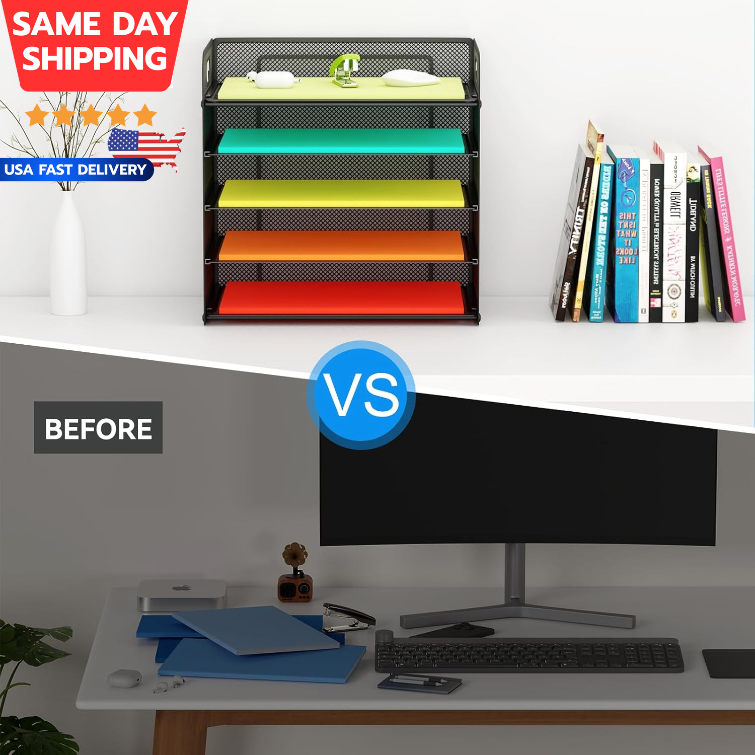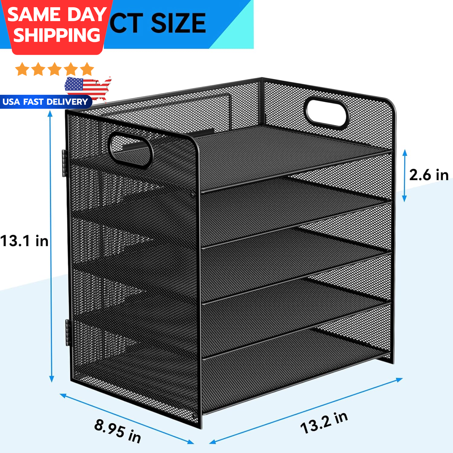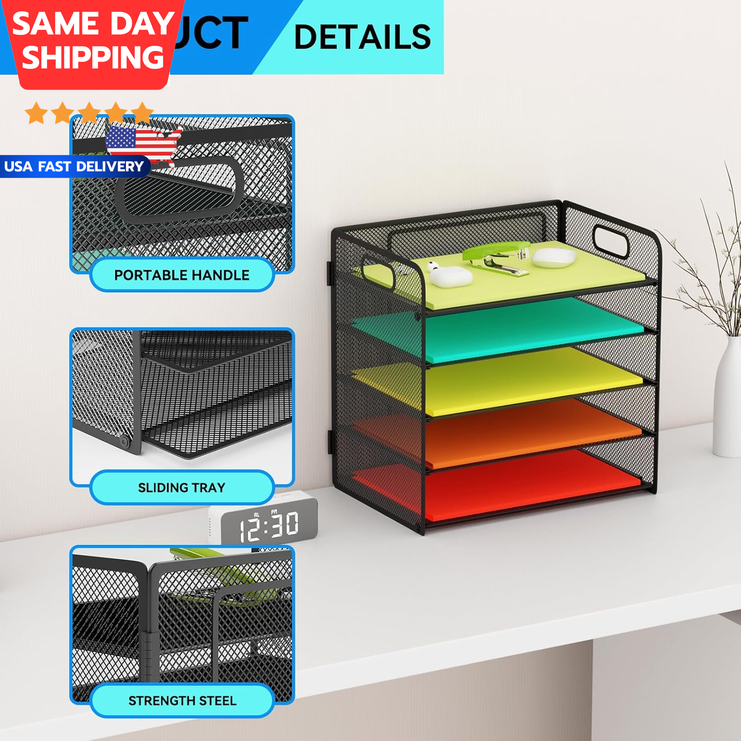 This 5-tier paper tray organizer is a game-changer for keeping my desk clutter-free! The sturdy metal construction holds papers, folders, and office supplies securely, while the compact size fits perfectly on my desktop. The built-in handles make it super easy to move around, and the sleek black design looks professional. Love how it maximizes vertical space without taking up too much room—super practical for home or office use!