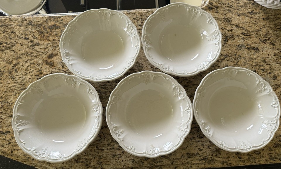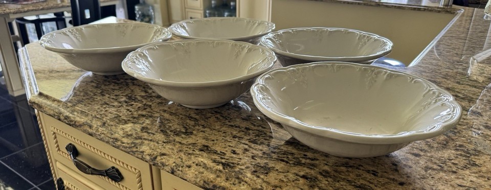 Set of 5 Vintage Amora Pasta or Serving Bowls – Embossed White Ceramic, Made in Italy, 12" diameter A charming set of five vintage Italian-made Amora bowls , perfect for serving pasta, salads, or entertaining. These eye-catching pieces feature a crisp white base with embossed decorations around the rim. Ideal for fans of European ceramics and retro tableware. Details: Brand: Amora (Italy) Quantity: Set of 5 Material: White embossed ceramic Size: 12" diameter × 3½" height Origin: Italy Condition: Excellent vintage condition — no chips, cracks, or crazing (please review photos) Why You’ll Love Them: Made in Italy with classic European style—perfect for rustic or cottage-themed tablescapes. Great for serving large dishes or as striking decorative pieces (flower arrangements, centerpieces). Unique brand adds intrigue and special appeal — not the typical mass-market dinnerware. 📦 Shipping & Pickup: Ships safely with sturdy packaging and insurance. Local pickup available in [Brooklyn, 11201]. Open to combined shipping on multiple purchases 5 Vintage Amora Pasta or serving Bowls made in Italy 12"x 3 1/2" White Embossed