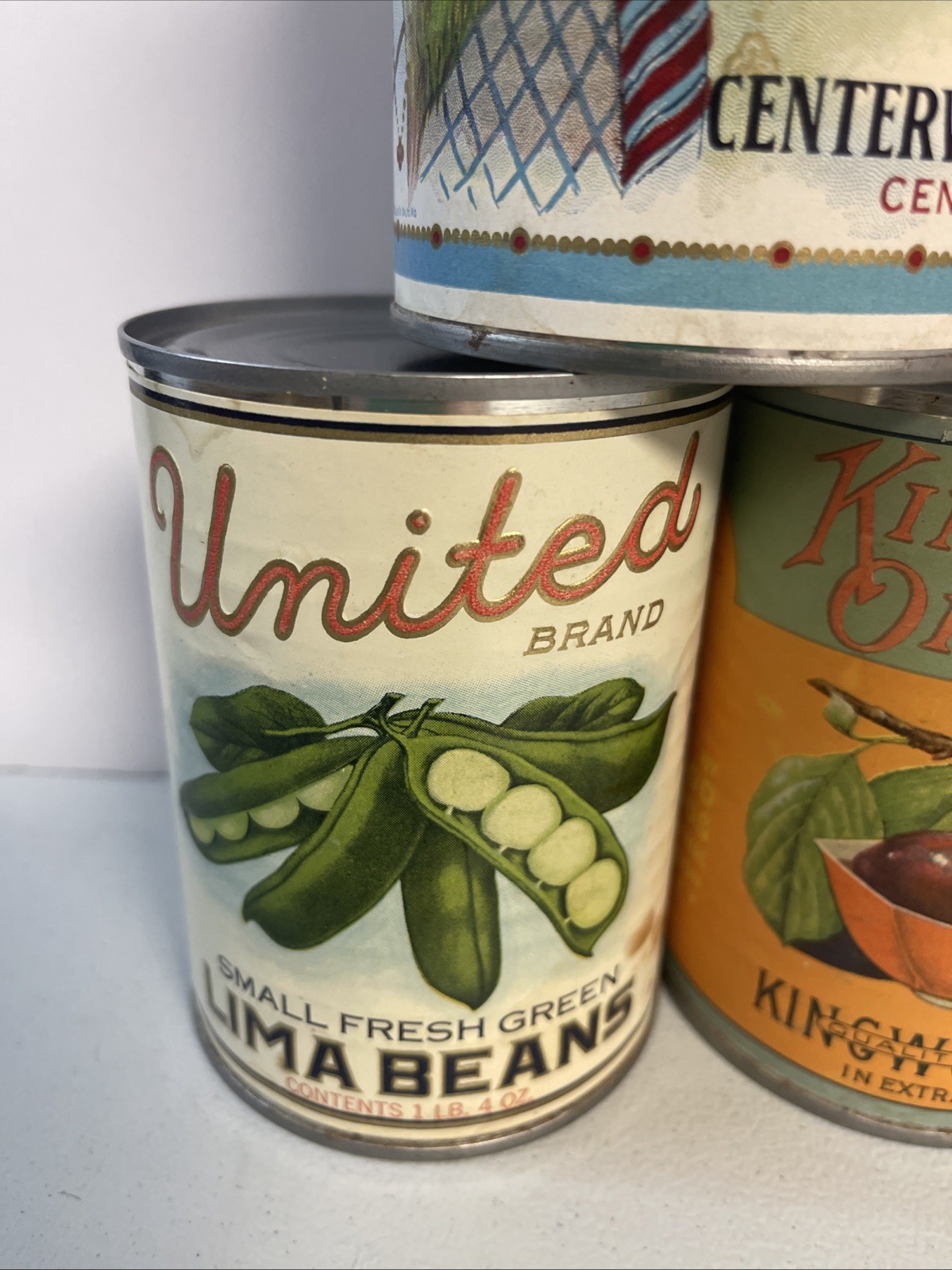 The product is a set of 5 vintage tin cans that are sealed paper labels and feature various brands such as Red Cherries -Forest City Allen Bros, Plums-Kingwood, Extra Sifted Peas-Centerville MD Squaw, United Grocers-Lima Beans, and Succitash-Olney & Floyd. The cans are multi-color and were created in the 1950s in the United States. These empty and sealed tin cans serve as a piece of advertising memorabilia and collectibles, showcasing the history and branding of different companies from the past. Perfect for collectors of vintage tins or those interested in American advertising history. T hank you for looking. This item is from a smoke free home. Please view all the photos. Check out all my other items.