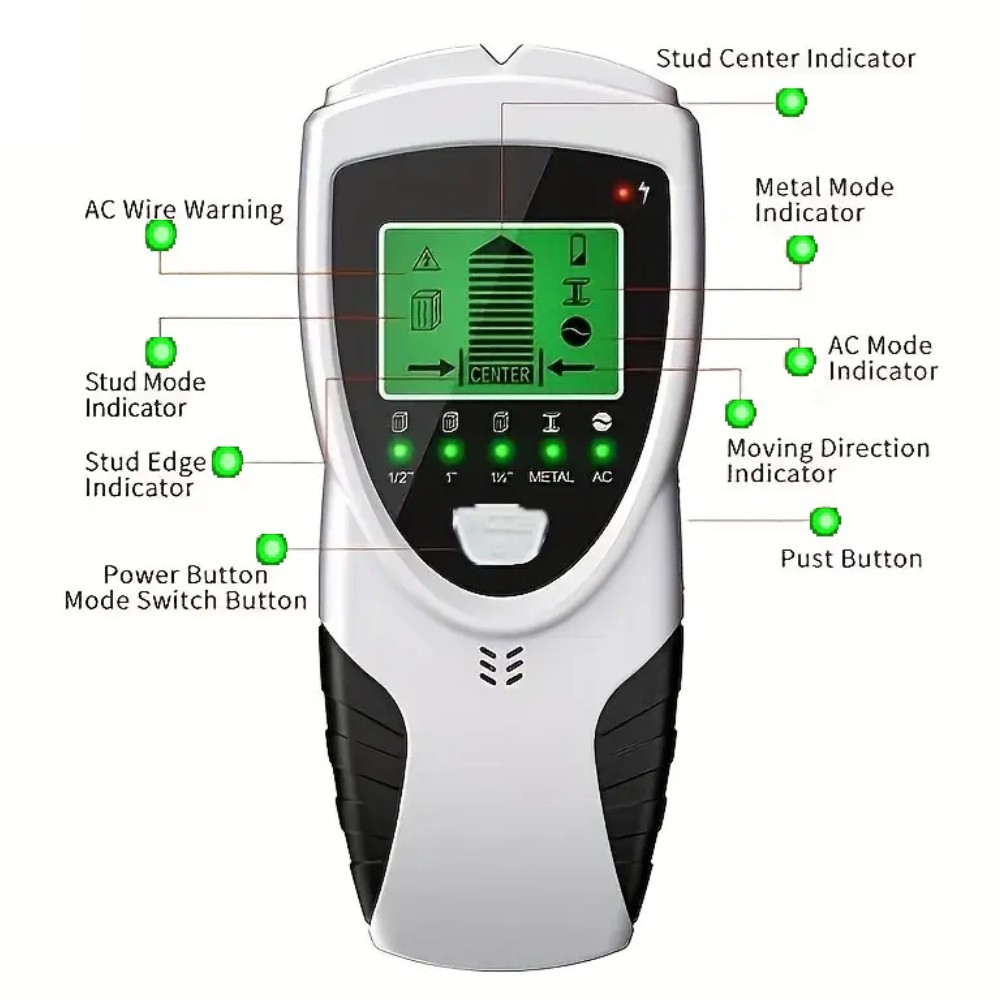5 in 1 Digital Stud Finder Wood Metal Pipe Wire Wall Scanner Sensor LCD Detector This 5‑in‑1 Digital Stud Finder is a must‑have tool for homeowners, DIYers, and professionals. Equipped with advanced sensors, it accurately detects wood studs, metal pipes, rebar, and live AC wires behind walls, floors, and ceilings. The bright LCD screen and audible alerts make scanning simple and precise, helping you avoid costly mistakes and ensuring safe drilling every time. Whether you're hanging shelves, mounting a TV, or planning a renovation, this wall detector gives you confidence and accuracy in seconds. Make drilling and decorating safer with this 5‑in‑1 Digital Wall Scanner. It offers: Stud Scan for locating wooden beams Metal Scan for detecting pipes, rebar, and metal framing AC Scan for identifying live electrical wires High‑visibility LCD display for clear, real‑time feedback Ergonomic design for comfortable, one‑hand operation Reliable, fast, and easy to use — perfect for any home project.