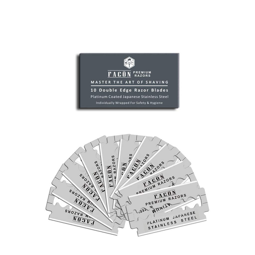 50 Facón Platinum Japanese Stainless Steel Double Edge Razor Blades for Safety Razor - Close Smooth Shaving Experience - 200+ Shaves Product Details Is Discontinued By Manufacturer : No Product Dimensions : 5.5 x 2 x 0.5 inches; 1.76 ounces Item model number : Facón 50 Manufacturer : Facón Razors Brand: FACON Number of Blades: 50 Recommended Uses For Product: Shaving Age Range (Description): Adult Skin Type: All SIGNATURE BLADES - Extremely sharp, smooth and comfortable. Barbershop/Salon Favorite! PREMIUM QUALITY - Japanese stainless steel blades, designed for smooth shaving experience ELITE STYLE - Fits all brands of safety/straight/barber razors, Genuine imported materials CONVENIENCE - Each blade is individually wax paper wrapped for safety and hygienic purposes