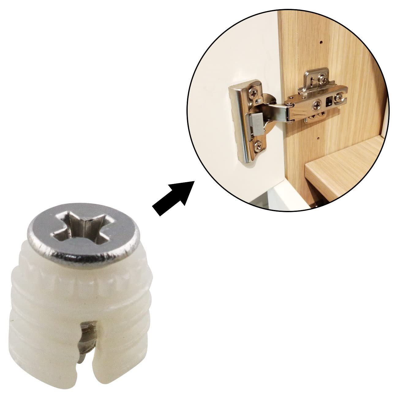 Specification: Product name: Hinge screw embedded parts (with mounting screws) Material: plastic, stainless steel Color: White Size: Rubber particle diameter: 9mm/0.35inch Rubber particle height: 9mm/0.35inch Rubber screw hole: M4 Screw length: 10mm/0.39inch The package contains: Glue with teeth opening*50pcs Mounting screws*50pcs Durable plastic particles can be used for many years. Other advantages include rust free, corrosion resistance, aging resistance, high toughness, ease of use and disassembly. Easy to install, excellent remedy for cabinet maintenance involving loose screws in composite wood. These pins and screws facilitate maintenance. Drill a hole with a diameter of 9 mm and a depth of 9 mm, and then tap in the dowel insert. With installation screws, you can install it as long as you have a screwdriver ready, which is convenient to use. New furniture can be expensive. If part of it breaks, you don't need to replace the whole furniture. You don't have to spend hundreds of dollars to buy a new one, but you can repair your furniture at a low cost.