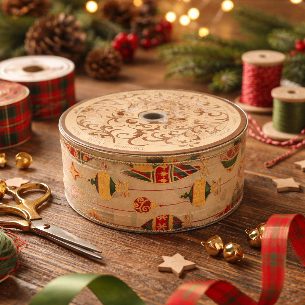 50 Yd 2.5” Ribbon Wired Designer Quality Christmas Ornament Print VTG Taiwan NOS Vintage designer-quality wired holiday ribbon (20+ years old) Made in Taiwan (often preferred for older, higher-quality decorator ribbon) Rich traditional Christmas ornament print in red/green with gold metallic accents Wired edges hold their shape beautifully for bows, wreaths, tree toppers, garland, stair rail décor Large decorator roll: 2.5” wide x 50 yards Material: 100% polyester Label notes bow tying cord & instructions included inside (as printed on spool) Distributed by SWC (Bentonville, Arkansas) — stated for provenance only, not as brand • • Mockup of ribbon on a craft table included in photos. Condition New old stock (NOS). Vintage ribbon spool appears unused and remains in original protective wrap. Light storage wear to packaging/label possible from age/handling. Please review photos for exact condition and design detail. Add a classic, upscale holiday look to your seasonal decorating with this vintage wired Christmas ribbon , featuring elegant ornament motifs in traditional red, green, and gold metallic accents. This is a full decorator spool (2½ inches wide x 50 yards) with wired edges that hold crisp, professional bow shapes—perfect for wreath makers and holiday decorators who want that “finished,” boutique look. Notably made in Taiwan , this ribbon reflects the higher-quality production common in late 1990s–early 2000s seasonal décor, with rich metallic detail and a sturdy wired edge that performs beautifully for large bows, garlands, and tree trimming. A wonderful choice for professional holiday styling, gift wrap, and craft projects—especially for those who seek vintage decorator supplies. vintage wired ribbon, made in Taiwan ribbon, Christmas wired ribbon 2.5 inch, ornament ribbon, wreath ribbon, designer quality ribbon, holiday ribbon spool, 50 yard wired ribbon, traditional Christmas ribbon, red green gold ribbon, craft ribbon, wreath making supplies, tree ribbon, garland ribbon, bow making ribbon, NOS ribbon, decorator ribbon “This is a full-size decorator spool with wired edges designed to hold shape for professional bows and wreaths.”