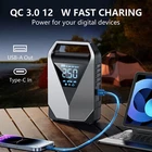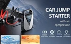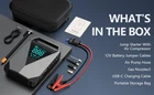 New Digital display model Car Jump Starter with Air Compressor product Features: 【 One charge, 55 starts 】 The Digital display model Car Battery Starter with Air Compressor has a peak starting current of up to 5000A and a large battery capacity, which makes it especially suitable for trucks, boats and other heavy-duty vehicles.The Car Battery Starter is capable of starting all 12V vehicles (10L gasoline/10.0L diesel engines) up to 60 times. In addition, our car battery starter is equipped with a starting function for completely dead batteries. 【 Smart Digital Tire Inflator 】 The Car Starter Battery Pack with Air Compressor is equipped with a smart screen and tire pressure detection function to make your operation more convenient. Not only that, car starter can adjust the inflation mode at any time during the pumping process. The jump starter battery pack supports 4 selectable units (PSI, BAR, KPA, Kg/cm2). 150PSI air compressor takes about 2 minutes to inflate an average car tire to 30PSI. 【 Severe weather, no worries 】 Conventional products lose starting ability quickly as temperatures drop, gradually losing functionality at -20°C (-4°F). The new Digital display model Jump Starter utilizes new technology to ensure a strong start in temperatures as low as -4°F (-20°C). The 5000A Jump Starter battery pack can also restart a 12V un-powered vehicle (10.0L gasoline/10.0L diesel) in seconds and supports 10,000+ charge cycles. 【 Multi-protection, safe and reliable 】 Digital display model Jump Starter has 10 built-in safety protection technologies (reverse polarity, anti-spark, short circuit, overcharge, overcurrent, low temperature, high temperature, overvoltage, overload, reverse charge). 【 Multi-Function Starter 】 The Digital display model starter box also comes with a battery, tire inflator and LED flashlight.The 300 lumen LED light supports three lighting modes: continuous illumination (white), strobe and SOS. 【 Key function description 】 1) Lighting key: short press white light is always on → red and blue burst flash → SOS warning light → turn off the flashlight, any mode can be used in power-on mode, the display only shows the power when used in power-off mode. 2)+ key: short press + key to increase the value of air pressure, can be increased cyclically; long press to increase the value of air pressure quickly, can be increased cyclically. 3)-Key: short press - key to decrease the air pressure value, can cycle to decrease; long press to quickly decrease the air pressure value, can cycle to decrease. 4)Power key: Long press 2S to turn on/off, short press to start/stop in power-on state. 5)Mode key: short press to switch mode, bicycle/motorcycle/small car/basketball/pressure-retaining mode, can be switched cyclically 6)Lighting function: LED flashlight/light, red and blue burst flash warning, SOS for help. 7. Charging function: USB output to charge the cell phone under power-on state, 60S automatic power-off shutdown without any operation, display and key lights out, power indicator flashes to remind when power is less than 10%; no USB output under power-off state. 3.8. The brightness of the display light is according to the maximum brightness allowed by the LED lamp beads. 【Note】 Please do not use the air pump function continuously. When the tire battery compressor gets seriously hot, please cool down for a few minutes before continuing to inflate the tire. Why choose our products?