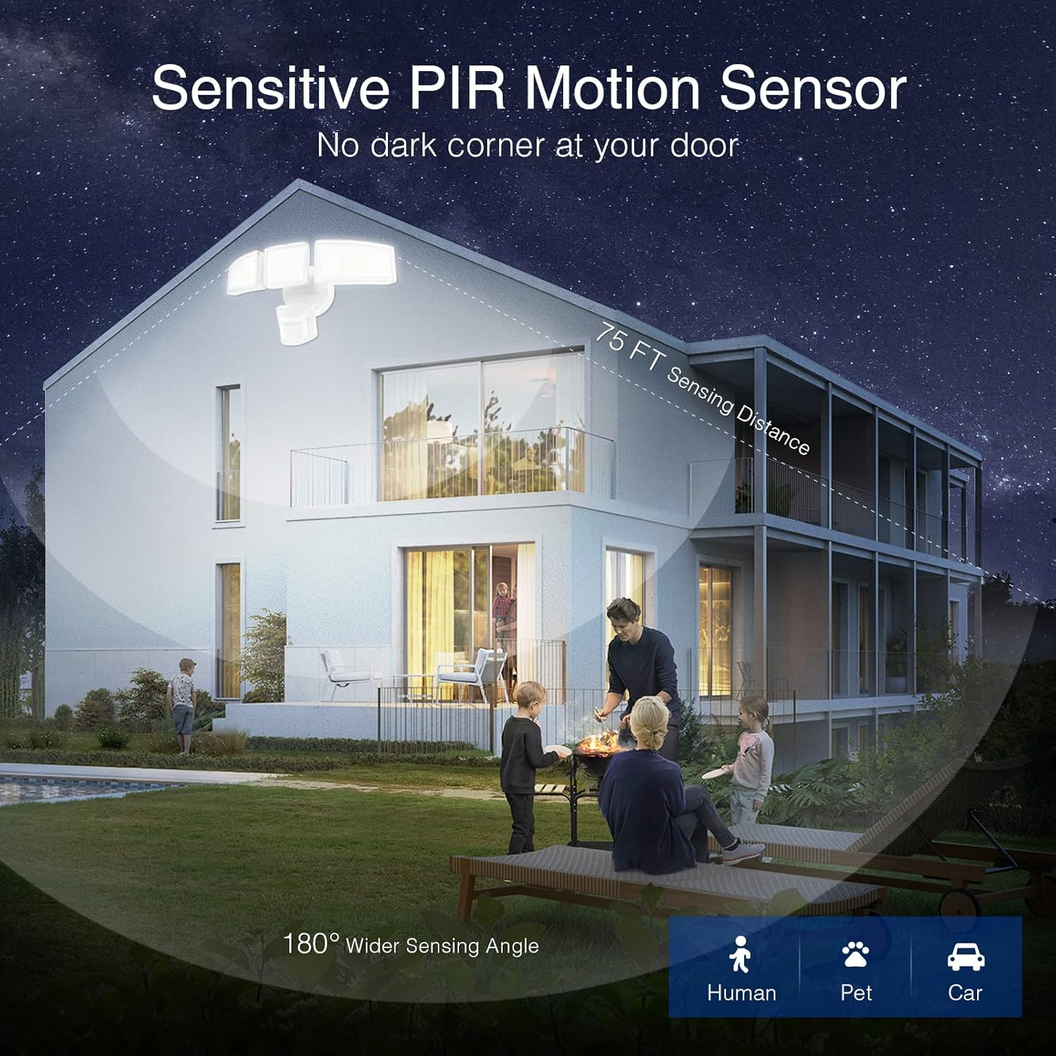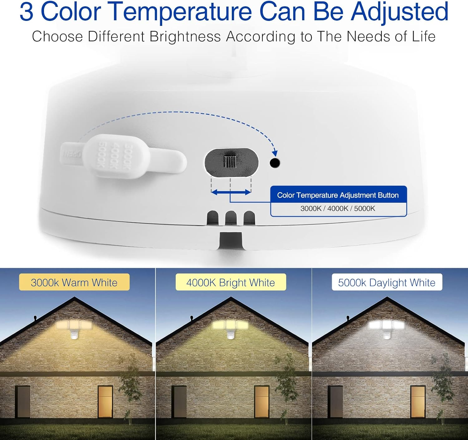 【3 COLOR TEMPERATURE ADJUSTMENT】: This security flood lights with motion sensor offers you the option to choose your color temperature directly with one flood light. With the 3 CCT color button, you can choose between 3 color temperatures from warm white 3000K and cool white 4000k and daylight 5000K. You can easily install the light anywhere you want. 【3 LIGHTING MODE CONTROL】: Saatly motion sensor outdoor lights have 3 working modes. First, On-Time Mode, light allows manual control on and off of the light.Second, AUTO Mode, when the movement is detected in darkness, the light will turn on & after 5 seconds to 5 minutes it will turn off depending on your setting on the “Time” button. Third, Dusk To Dawn Mode, light will automatically turns on at night and stays off at daytime, work only during the night. 【40W BRIGHTNESS & ENERGY SAVING】: This 40W outdoor flood light is powered by ultra bright 160 LED beads, through optical filter lenses, the flood light shines anti-dazzle beams, giving a comfortable lighting experience. producing up to 4600lm high brightness, equivalent to 160W incandescent bulbs, saving 80% of your electricity bill. 【ENHANCED MOTION SENSOR】: LED outdoor security lights are highly sensitive, with built-in sensors that respond quickly after monitoring the motion of humans, cars or pets. The outdoor sensor light can be illuminated from 5 seconds to 5 minutes (support your own manual settings). The light supports 180° motion detection angle and the sensing distance can reach 72 feet, protecting the safety of your yard and bringing you an intelligent and user-friendly lighting experience. 【IP65 WATERPROOF】: The outside motion sensor light and its sensor are made of full aluminum, have an excellent heat dissipation, which is more durable and the lifespan of light will be up to 50,000hrs. The lights are equipped with IP65 waterproof material, they can adopt any weather like a rainstorm, sleet or snow. Perfect motion flood light for porch, back yard, front door, garage, driveway, walkway, garden and step, etc. Product Description Dusk to Dawn Mode Sensor lights outdoor motion detection will automatically turns on at night and turns off at daytime, work only in the night. (Please set the LUX to the min) Wattage: 40 Watts Luminous Flux: 4600 Lumen Color:3000K/4000K/5000K Adjustable Detection Angle: 180 Degree Length: 384.64mm / 15.14inch Special Features: IP65 Waterproof, Motion-Sensor Specific Uses: Backyard, Front Door, Driveway Shade Material: Full Aluminum Bright & Wide Sensing Range Flood Light Why choose Saatly LED Security Lights ? Saatly security motion sensor outdoor lights provide wide-angle illumination with 3 adjustable heads design. You can freely move the spot lights upwards, downwards and horizontally, cover your home or business with flexible security lights. three color adjustable, you can choose different lights according to your different scenes every day, equivalent to you spend one money to buy three lights, but also for you do not know what color to choose and save time. Saatly security light has 3 independently rotating light heads Recommended installation height is 7.2 FT -14.8 FT The operating voltage of the security light is 120V (110V-130V) 3 color temperatures (3000K/4000K/5000K) to choose from Not Solar Powered, Lights are AC Power Hardwired Please make sure the motion sensor faces the person when mounted on the eave/soffit, and we suggested mounting on the wall Om Time Mode If you need a light that doesn't go out at night, you can choose saatly LED security light. The outdoor security light installation process was simple. You can use the switch to control the light directly or to keep the it on constantly. Auto Mode Saatly Outdoor LED Motion Sensor Light with Maximum 72ft detection range/180° sensing angle provides you with a wide range of motion detection to help you detect cars, humans and pets. Dusk to Dawn Mode Upgraded dusk to dawn flood light with the photocell sensor, this outdoor motion sensor security light can automatically turn on at night and go off at daytime, which greatly save your electricity bills. Adjustable Head & Motion Sensor This LED security light has 3 adjustable heads, you can rotate them to a positon according to your needs, so you will have more installation angle options, customize your lighting area.(Note: Make sure the motion sensor face outside when mount on soffit/eave. We recommend mounting on the wall) Aluminum & Heat Dissipation All-aluminum head is corrosion-resistant and will not fade even after decades. Excellent heat dissipation makes the lamps durable, with a service life of up to 50,000 hours. By choosing Saatly's security lights, you can reduce the number of times you have to replace your lights, saving your money. IP65 Waterproof The three-head 160 LED bead security light is waterproof to IP65, ensuring safety for outdoor use against rain, snow or hail. It can be used in any weather.