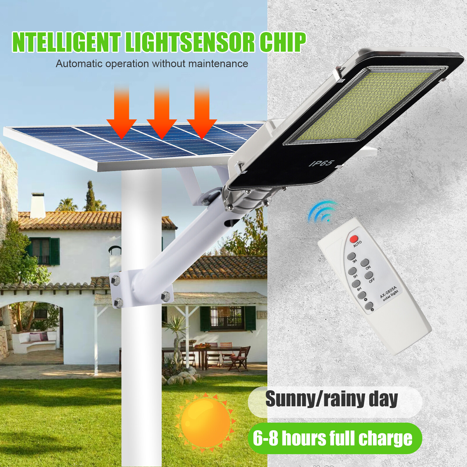 Please note that the LED beads of 2000W is 1845 LED. And the 5000W solar street light has 2014 LED beads. [Exceptional Energy Efficiency,NO ELECTRICITY BILL]: The solar panel of this solar street light has a photovoltaic conversion rate of up to 21%, ensuring you get the most out of every ray of sunshine.Save on your electric bill.Rechargeable even in rainy days. [Full LED Lighting Panel]: The entire panel is covered with 2014 high-performance LED beads,Low light decay.The overall brightness is 80% brighter than ordinary solar street lights outdoor,and the light has a range of up to 2192sq.ft.Can be used in backyard, parking lot, parking garage, patio, etc. [Extended Illumination Time]: Outdoor solar light is equipped with a 120,000mAh high-capacity battery.Charge your lights for just 6-8 hours and enjoy a generous 16-20 hours of continuous, energy-efficient lighting, perfect for long evenings and overnight use. [Weather-Resistant Reliability]: Outdoor split solar street light upgraded die-cast aluminum and tempered glass panel material.IP67 waterproof design ensures that your lights will shine brightly, regardless of the weather conditions, making them a reliable choice for outdoor use. [Remote Control and Dusk-to-Dawn Mode]: The Solar led street light comes with a convenient remote control, allowing you to adjust between 9 different brightness levels effortlessly. It also features a dusk-to-dawn mode with intelligent sensing, automatically turning on at dusk and off at dawn. [Wall Mount + Pole Mount]: Led solar street light comes complete with all the necessary hardware tools for installation (excluding the pole) and a comprehensive installation guide. We can easily mount it on a wall, post, tree or any outdoor structure. No matter your choice of installation, we will quickly enjoy efficient outdoor lighting. [WORRY-FREE WARRANTY]: provides 2 years after-sales warranty. Please feel free to contact us if you have any questions and we will reply to you within 24 hours.