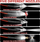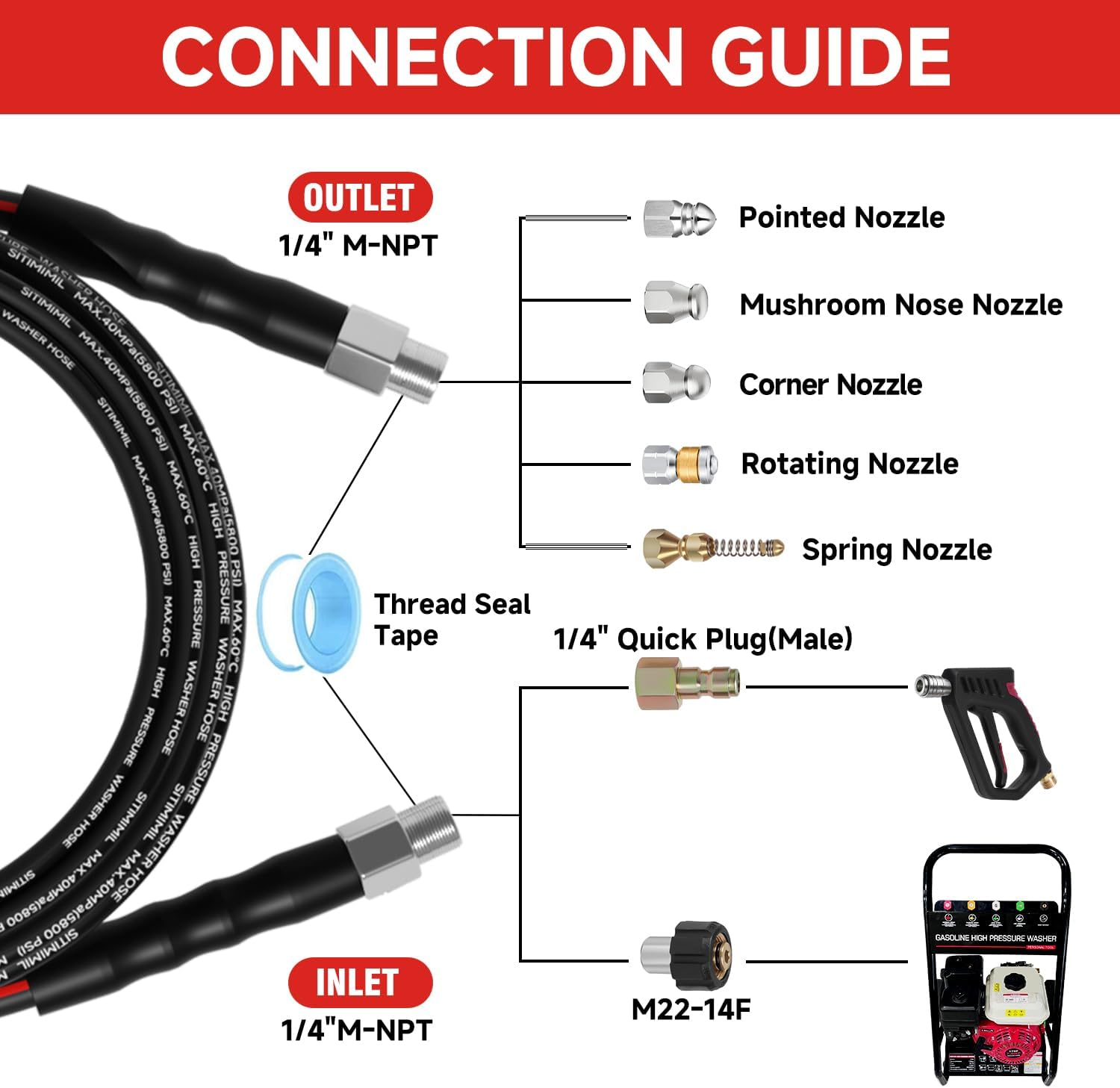 PROFESSIONAL SEWER JETTER KIT INCLUDES: 1 x sewer jet hose, 1 x Spring Nozzle, 1 x Pointed sewer jetter nozzle, 1 x Corner sewer nozzle, 1 x Rotating sewer jetter nozzle, 1 × Mushroom nose nozzle, 1 x M22 female to 1/4’’ female NPT coupler, 1 x 1/4’’ Quick connect plug,1 x Handle strap for storage,1 x Waterproof tape, 1 x Box of pearl corsage pin, 2 Spanners, 1 Pair of gloves. THICKER CLEANER HOSE EXCELLENT MATERIAL: The outer layer of the upgraded hose is made of thicker material, which can delay aging and increase wear resistance. The reinforcing layer is a chemically bonded 1/4 " high-tenacity polyester fabric.WORKING PRESSURE with 5800 PSI: With working pressure up to 5800 PSI and temperatures up to 35°F/+122°F, blockages can be easily cleared 5 ALL-ROUND SEWER JETTER NOZZLES :More powerful Pointed nozzle design with 1 front spray and 6 rear spray clean and unblock water sideways to clear blockages at the corner, more powerful cleaning. Mushroom nozzle has one front nozzle at 0° to remove blockages, and 3 rear nozzles at 33° to wash away loose debris from the front nozzle.Spring nozzle,Used to dredge sewer pipes that need turning When the turning sewer is blocked, other nozzles cannot unclog it.This turning spring head nozzle can quickly complete the dredging and relieve troubles QUICK CONNECT PLUGS FOR EASY USE:With our quick connect plugs and metric M22 to 1/4 inch female Npt fittings. The quick connect plug is ideal for exchanging pressure washer outlets, sewer jetter hoses, guns, and nozzles. It ensures a solid connection with the quick coupler every time. The pressure washer coupler converts metric M22 14mm male NPT thread to 1/4" Female NPT. APPLICATION SCENARIO:The pressure washer drain jetter can be used indoors and outdoors to clean cars, motorcycles, driveways, roofs, bathrooms, toilets, kitchens, swimming pools, siding, windows, floors, gutters and more. We added 2 wrenches for installing nozzles or accessories, 1 box of pearl brooches to help clear clogged nozzles, waterproof tape to prevent nozzles from leaking,Gloves avoid direct contact with stains and equipped with a handle storage strap for easy carrying and storage. Thoughtful accessories make your use stress-free to use. Product Description 1 Bending Limiter 2 Stainless Steel Interface 3 All Weather Usage