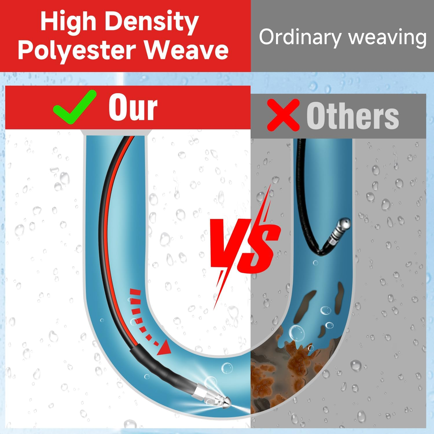 This sewer jetter kit is a game-changer for tough clogs! The heavy-duty hose and multiple nozzle options make deep cleaning drains effortless. I love the rotating nozzle for stubborn buildup, and the included gloves and waterproof tape are thoughtful extras. It hooks up easily to my pressure washer and blasts through blockages like nothing. No more calling plumbers—this kit saves me time and money. The storage handle keeps everything organized, and the thicker hose material feels durable. Highly recommend for DIYers and pros alike!
