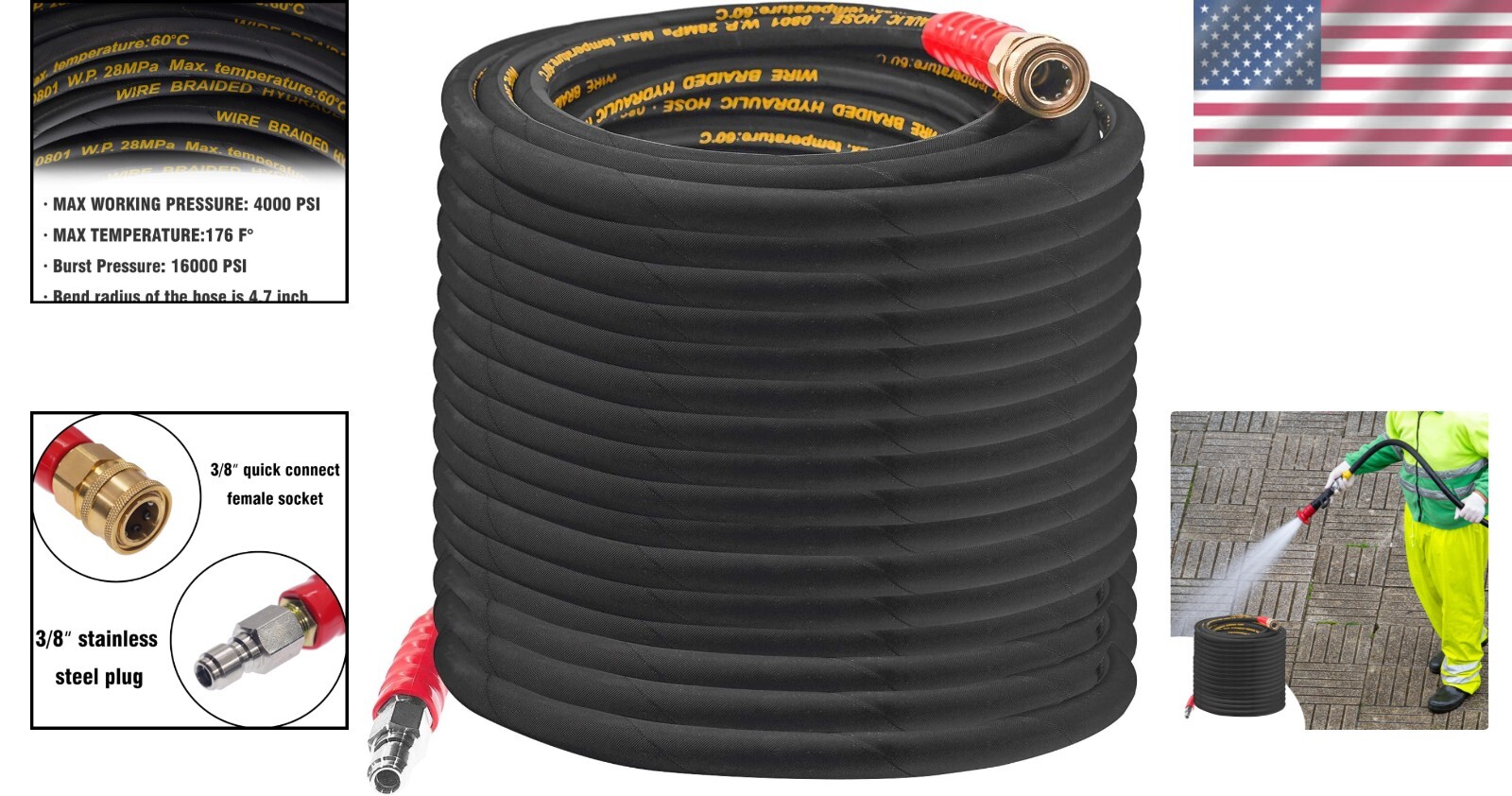 Pressure Washer Hose 50Ft Rubber 4000 PSI Quick Connect Power Cleaning ‹ › ‹ › ‹ › ‹ › ‹ › ‹ › ‹ › ‹ › ‹ › 50Ft Pressure Washer Hose High Quality Rubber Construction Made from durable rubber with a robust steel-wire braid to withstand high working pressure. Designed specifically for power cleaning equipment, suitable for both gas and electric pressure washers. Specifications: Length: 50 Feet Max Working Pressure: 4000 PSI Burst Pressure: Up to 16000 PSI Max Temperature: 176°F Flow Rate: 2.5 GPM to 5 GPM Effortless Connectivity: 3/8 Quick Connect design ensures compatibility with most pressure washer models. Equipped with a 3/8" quick connect female socket and a 3/8" stainless steel plug for secure attachments. Versatile and Reliable: Perfect for a multitude of cleaning tasks including vehicles, floors, windows, driveways, roofs, swimming pools, and siding. Enhances your home and business cleaning capabilities while extending the life of your cleaning equipment. Important Note: This is a pressure washer hose, not a garden hose. Only suitable for use with pressure washers. Why choose our Pressure Washer Hose? Upgrade your cleaning experience with our 50Ft Pressure Washer Hose. Designed for durability and high performance, this hose not only withstands extreme pressure but also simplifies your cleaning tasks. With its wide compatibility and efficient design, it’s the ultimate tool for maintaining the pristine condition of your vehicles and property. Invest in a long-lasting, safe, and effective pressure washer hose today and enjoy a cleaner environment with ease! Shipping Free & Fast Shipping - We offer free shipping to most of the USA with a normal delivery time of 3-7 days. However, due to the current situation, additional delivery time (up to 3 weeks) may be required for some items. Alternative Carriers - We may use alternative carriers (e.g. USPS, FedEx, UPS, etc.) to ensure your package arrives safely and on time. Due to the use of multiple carriers, we are unable to provide a tracking number automatically. Handling Time - Orders are processed and shipped within 1-2 business days of receiving cleared payment. Shipping Restrictions - Shipping to Alaska, Hawaii, Puerto Rico, Guam, and other US territories may incur shipping charges or delivery restrictions. Please contact us before ordering, or your order can be refunded/cancelled. State Restrictions - There may be restrictions based on your state of purchase. For example, certain items may not be shipped to California due to state regulations. Contact for Tracking Updates - If you require tracking updates or have any concerns about the delivery of your order, please feel free to contact us, and we will be happy to assist you. Return 30-Day Hassle-Free Returns - We want you to be completely satisfied with your purchase. If you are not, you can return the item within 30 days of receiving it for a full refund or exchange. Easy Return Process - To start a return, simply contact us and we will provide you with a prepaid return shipping label and detailed instructions. Restocking Fee - There are no restocking fees for returns. However, the buyer is responsible for return shipping costs if the return is not due to a seller's error. Refund Processing Time - Refunds will be processed within 5 business days of receiving the returned item in its condition. Payment We accept all major credit cards, PayPal, and Apple Pay for your convenience. Your payment information is secure and encrypted to ensure a safe and seamless transaction. Please complete your payment within 3 days of purchase to avoid any delays in shipping. Feedback Your feedback is extremely important to us. We strive to provide the best products and customer service possible. If you are satisfied with your purchase, please take a moment to leave us a positive review. If you have any concerns or issues with your order, please contact us before leaving negative feedback. We are committed to resolving any problems and ensuring your satisfaction. Contact Us If you have any questions or concerns, please feel free to out to our customer support team. You can contact us through the eBay messaging system. We are available Monday to Friday, 9:00 am to 5:00 pm EST, and we will do our best to respond to your inquiry within 24 hours. Buy it now and enjoy a pleasant shopping experience! Unit Quantity: 50 ft Features: Quick Connect,High Quality,Durable,Reinforced,Support High Working Pressure,Synthetic Rubber Inner Tubes,3/8" Quick Connect Items Included: Hose,Pressure Washer Hose Material: Rubber Type: Pressure Washer Hose Power Source: Corded Electric Maximum Pressure: 4000 psi Voltage: 220 V Horsepower: No Horsepower Power: 500 W Soap Tank Capacity: No Soap Tank Fuel Tank Capacity: No Fuel Tank Engine Size: No Engine Size Noise Level: No Noise Level Color: Black Item Diameter: 0.38 in Item Length: 50 Feet Style: Contemporary Item Weight: 12 lb Unit Type: ft