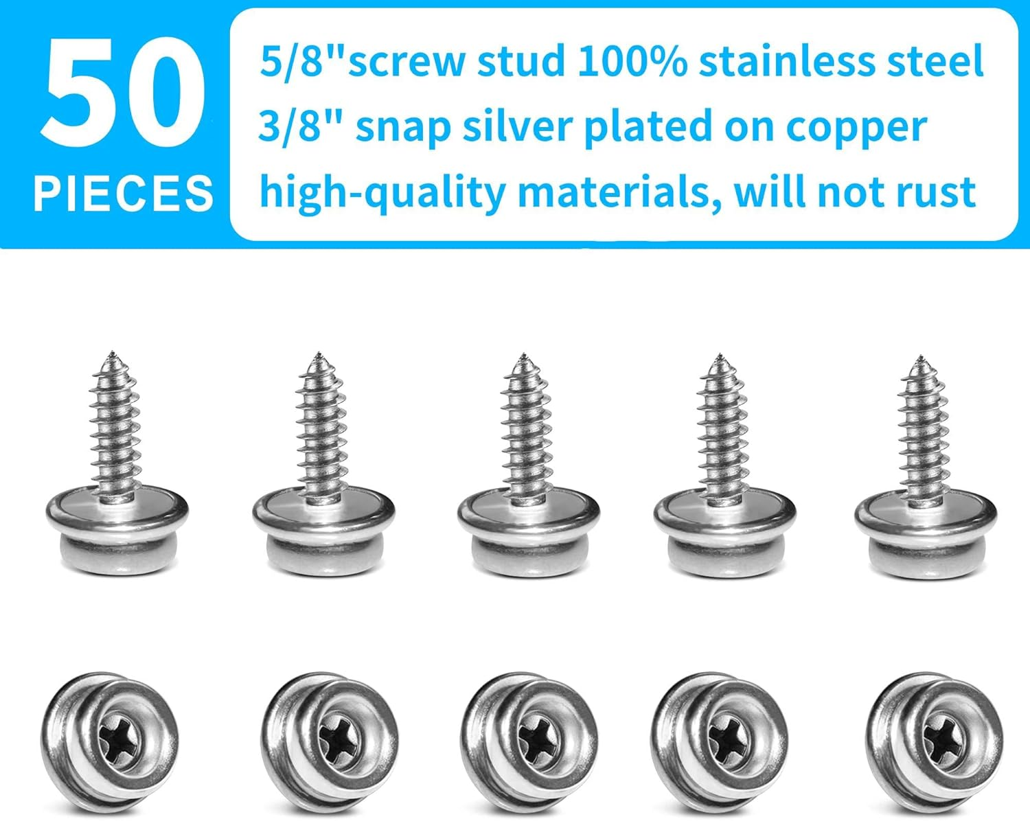 Product Description: Marine Grade Stainless Steel Boat Canvas Snaps – 50-Piece Set Upgrade your boat, tarp, or outdoor canvas project with this 50-piece set of marine-grade stainless steel snap screws. Designed for durability and corrosion resistance, these snaps provide a secure and reliable fastening solution in both freshwater and saltwater environments. Ideal for boats, tents, furniture, and outdoor covers. Key Features: Premium Quality: Stud snaps made of 100% stainless steel; snaps silver-plated on copper for extra corrosion resistance. Marine Grade: Engineered to withstand saltwater environments, ensuring long-lasting performance. Durable & Strong: Deep, thick coarse threads provide excellent grip on softer materials like wood, MDF, and canvas. Multi-Purpose Use: Perfect for boat covers, pontoon covers, tarps, tents, awnings, furniture, leather, pool covers, and fabric. Dimensions: Screw Stud Length: 5/8" | Canvas Snap Socket: 3/8". Easy Installation: Can be installed quickly with a standard Phillips head screwdriver. Complete Set: Includes 50 stud snaps with screws for all your fastening needs. Reliable & Secure: Designed for both indoor and outdoor applications, providing secure attachment every time. Satisfaction Guaranteed: We value every customer and provide a 100% satisfaction guarantee with free replacements if needed. Why Choose These Boat Canvas Snaps? Built for durability, corrosion resistance, and ease of use, these stainless steel snaps are perfect for marine and outdoor applications. Their superior material and design ensure reliable fastening for all your canvas, fabric, and marine projects. FAQs: What sizes are included? Each set includes 50 pieces: screw stud length 5/8" and canvas snap socket 3/8". Are these snaps rust-resistant? Yes, made from marine-grade stainless steel and silver-plated on copper to resist corrosion. Can these be used in saltwater environments? Absolutely, they are designed for marine applications and will not corrode in saltwater. What materials can these snaps be used on? Ideal for canvas, wood, MDF, leather, fabric, tarps, tents, awnings, and boat covers. How do I install these snaps? They can be easily installed with a standard Phillips head screwdriver. Are these suitable for outdoor use? Yes, designed for both indoor and outdoor applications. Will these snaps hold securely on softer materials? Yes, the deep, thick threads provide excellent holding power on softer surfaces. How many pieces are included in this set? The set includes 50 stud snaps with screws. Is this a replacement for existing boat snaps? Yes, they can replace worn or damaged boat canvas snaps. Do you offer a warranty or guarantee? Yes, we provide a 100% satisfaction guarantee and free replacements if any issues occur.