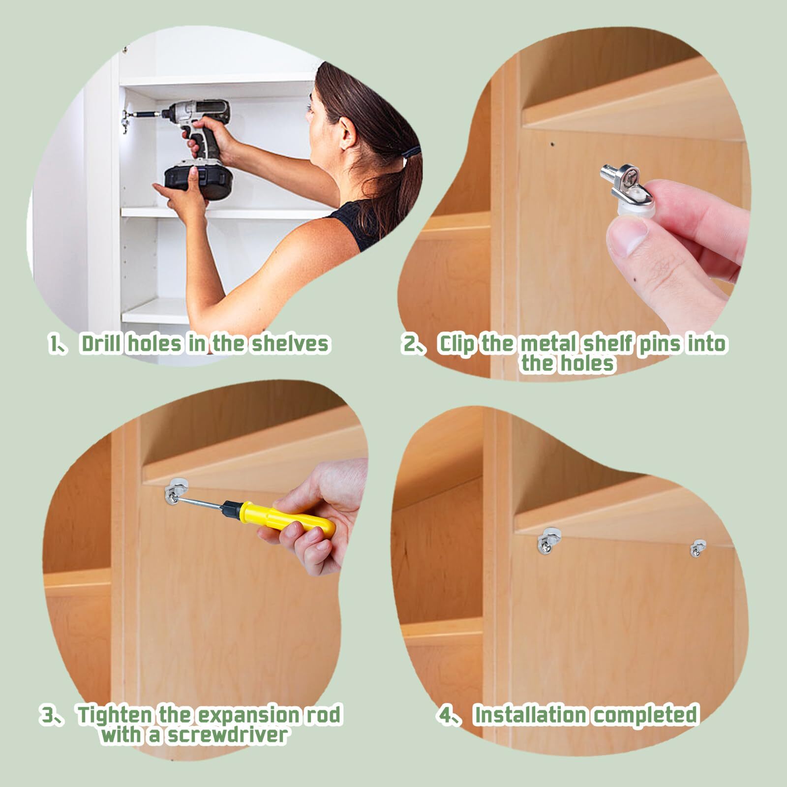 Welcome to my stores! Fantastic Offers Await! where satisfaction is our guarantee. 50 Pcs Cabinet Shelf Pegs, 1/5 Inch 5mm Cabinet Shelf Pegs for Shelves, Metal Shelf Pegs Pins for Support Cabinet Shelf Kitchen Furniture Book Shelves Holder Locking Pins (Silver) Gallery Details Package Included: 50 PCS x Shelf Support Peg Note: 1. Due to the light and screen difference, the item's color may be slightly different from the pictures. 2. Please allow 1-2 cm differences due to manual measurement. Key Features Package Contents: You will receive 50 metal shelf nails, the quantity is enough to meet your daily needs, you can also share it with your family and colleagues. Premium Material: Our shelf support pins are made of nickel-plated steel, strong and durable, not easy to fade and break, and are polished and plated for longer service life. With suction cup: The support pile is equipped with environmentally friendly PVC suction cup, which is safe and odorless, adheres more closely to the partition, has a cushioning effect and is more anti-slip, perfect for 5 mm/0.2 inch pre-drilled holes (please check the original hole size before purchasing. Your hole should be equal to or Slightly smaller listed tight fit diameter). Easy to install: Our shelf pins are strong and do not need to be tightened, use a screwdriver to turn the expansion rod, the holes for the support pins are very tight and will not slip off after tightening, the smaller ones are almost invisible, the support posts can move freely until they are adjusted to the right position, The laminates are also free to move and any shape and size of laminates can be placed on the supporting piles. Wide application: These shelf bracket nails have strong load-bearing capacity and can be used for various cabinet shelf supports, perfect for kitchen cabinets, bookcases, wardrobes and other types of adjustable shelves. The design with silicone pads is also suitable for display glass shelves. Thank you for shopping with us! Contact Us ✉ For any inquiries, please reach out through the eBay messaging system. We strive to respond within 24 hours. Payment Methods 💵 We accept PayPal, credit cards, and other payment methods supported by eBay. Ensure your payment details are correct to avoid any delays. Shipping Information Your item will be shipped to the address listed on your eBay account. Please confirm your address before completing the purchase. Shipping typically takes 3-7 business days. In case of delays, please allow an additional 2-3 business days due to postal service issues or technical problems. We use reliable shipping services like UPS, FedEx, and USPS. We ship only to the 48 contiguous states. Unfortunately, we cannot ship to Alaska, Hawaii, US territories, APO/FPO addresses, or PO Boxes. Local pickup is not available. If there are any issues with your delivery, please contact us promptly. Feedback 👍 We appreciate your feedback and aim to earn your trust. If you are not satisfied with your purchase, please contact us and we will work to resolve the issue. Return Policy - We offer a 30-day return policy. - If the item is defective or you are not satisfied, contact us for a replacement or refund. - All returns must be sent to the address provided upon contacting us.