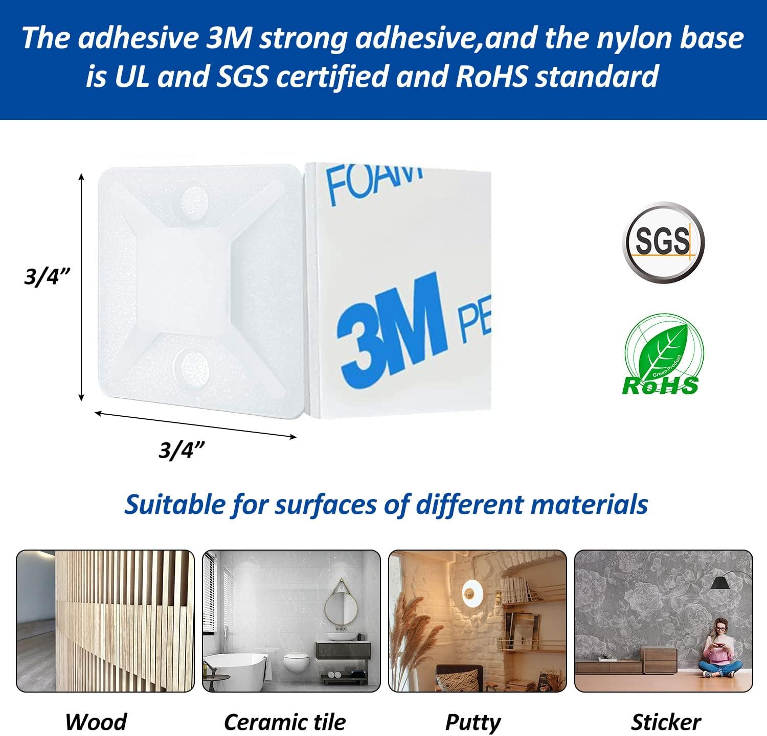 Business is our speciality NEW Strong Back-Glue Self Adhesive Cable Zip Tie Mounts Kit - 50 Set Cable Management Clips with 6" Zip Ties, Wire Holders - Outdoor Sticky Wire Organizer Clips-White FEATURES 50 Set Adhesive Cable Zip Tie Mounts: 50 pcs 3/4" x 3/4“ white adhesive mounts and 50 pcs 6 inch x0.14 inch black nylon zip ties Strong and Sturdy: Adhesive Zip Tie Mounts are manufactured from 3M Strong Adhesive and PA66 nylon with excellent viscosity and durability. Easy to Install: Mounts without tools, just peel the protective layer off the adhesive back and place it on a clean, flat and dry surface, press for about 10 seconds or so to maximize the adhesiveness of the tape. then pass the cable tie through the hole, locking teeth in the cable tie head. You also can use the built-in screw hole for added strength. Widely Used: This zip tie mount base can be used indoors or outdoors. Such as, indoors, our Wire Tie Holder works really well for guiding cords along the undersides of desks and tables, and can also be used along walls or other flat Surface .you can use it to hide cables and power cables to make your desktops tidy. Outdoors, you can use these Cable Tie mounts to secure the LED strips and some messy wiring. Quality Commitment: If you are not satisfied with your purchase, please get in touch with us, we provide 90-day money back.100% Satisfaction Guarantee for risk-free shopping! 3/4" 3M Back-Glue Self Adhesive White Strong Cable Zip Tie Mounts 50pack with 6" Ties, Screws, Outdoor Sticky Wire Fasteners Cable Clips Management Anchors Organizer Holders Squares Item model number CZTM-50 Style Zip Number of Pieces 50 Power Source Hand Powered Color White Material Nylon Country of Origin China Batteries Required? No Item Weight 4.2 ounces Maximum Diameter 0.4 Centimeters Item Length 6 Inches Batteries Included? No Size 50 Set Included Components Zip Tie, Zip Tie Mounts . Weight: 4.2 oz Ask us anyhting Free shipping PAYMENT We accept all payments via Ebay using Credit Cards , PAYPAL , Apple Pay and many others SHIPPING We are always working hard to ensure your package arrives as soon as possible. Please understand that some factors like weather, high postal traffic, and the performance of shipping companies are outside of our control.