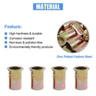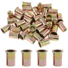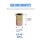 50pcs carbon steel flat head threaded rivetnut insert nutsert rivet nut set 【Specification】: Head Type: Flat Head Color: Yellow Material: Plated Carbon Steel Rivet Nut Size: 1/2"-13UNC About our rivet nut: These rivet nuts are suitable for a variety of thickness of the material including steel, fiberglass and plastic, etc, riveting firm with high efficiency, easy to use. Application: Perfect for automotive, furniture, decoration and other electrical and industrial products 【Package Details:】: Thread ------------ Drill Hole Size -------- Quantity 1/2"-13UNC ----------- 0.67'' -------------- 50pcs 【Note】: ♥ Please check the specific size of the product according to the second picture. Due to manual measurement, there may be errors, please don't mind. ♥ If you have any questions, please feel free to us and we will try our best to help you. ♞【Rivet Nut Size:】In this set, it include 50pcs 1/2"-13UNC rivet nuts for your work, which drill hole size is 17.1mm/0.67'', total length is 29mm/1.14''. ♞【Feature:】Head Type: Flat Head; Color: Yellow. Nuts have a work-hardened surface providing high-strength, load-bearing threads. ♞【Durable Quality:】All the rivet nut are made of carbon steel, with plated on the surface, strong and durable, you will no longer worry about them rusting and breaking when installing. ♞【Multipurpose:】It can be used for fixing in many different kinds of material including steel, fiberglass and plastic, etc. ♞【 Application:】Perfect for automotive, furniture, decoration and other electrical and industrial products.