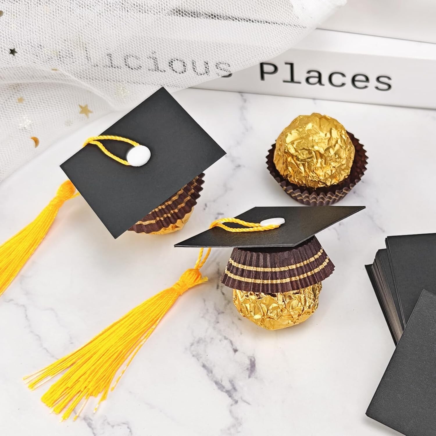 50Pcs Graduation Cap Chocolate Decorations,2025 Graduation Cap Cupcake Toppers Chocolate Decorations with Tassel Adhesive Dots for Class of 2025 Congrats Grad Cap Black About this item Package Included: You will get 50 sets of graduation hat decorations, including 50 pieces of cardstock, 50 pieces of mini graduation tassels, 50 pieces of snap fasteners, 100 pieces of adhesive dots, enough to meet your DIY use needs Size: These graduation cap decor are about 5 x 5 cm/ 2 x 2 inches, a proper size for you to hold small items, such as candies, chocolates, mints and more, to fill the cap with your delicious candies Unique Decoration: Our graduation cap decoration is designed to be the same as the traditional graduation cap used by people. Our graduation cap decoration is small and exquisite, but especially, its size is very suitable for holding small items, such as chocolates and candies. So it can also be used as a decoration for desserts to make them look more beautiful Memorable Moment: The graduation cap chocolate decoration is used in graduation parties, ceremonies and other activities related to graduation. These moments are meaningful and memorable for you. This decoration can create a stronger atmosphere for your graduation party Easy to Install:This graduation cap cupcake is easy to install. First, buckle the snap fastener in the hole in the middle of the card. Second, buckle the tassel in the snap fastener, then fasten the snap fastener. And finally, stick the adhesive dot on the snap fastener and install the small items you want DIY Gift:If you want shorter tassel