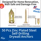 Self-Drilling Screws : Made from durable metal with precise threading, providing a strong grip and resistance to deformation. The deep threads ensure full anchor expansion for maximum stability. Simple Installation : Tap anchors into the drywall. Insert and tighten the screw. Remove easily, leaving no holes or damage. Versatile : Works with gypsum board, hollow bricks, and more. Perfect for mounting TVs, shelves, bikes, and other items. Package Includes : 50 wall anchors and 50 M4*30 mm self-tapping screws. Easy to install and remove without damaging walls.