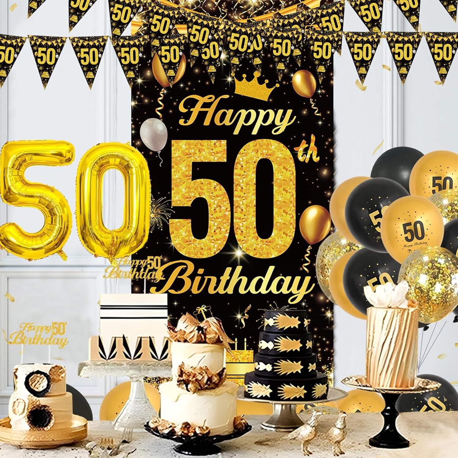 About this item đ€ă50th Birthday Decorations Setă- Our 50th black gold birthday decorations set includes 1pcs 50th Happy Birthday banner(23.6 x 47.2 inches), 1pcs happy 50th birthday cake topper, 1pcs birthday bunting, 1pcs number 50 balloon,10pc black balloons, 10pcs metallic gold balloons, 4pcs gold confetti balloons provide a perfect DIY balloons pack for black gold birthday party decorations. đ€ăPremium Qualityă- Our birthday party set is made of quality materials, all balloons are made of reliable latex, good quality, which are not easy to break. This glitter gold black birthday party background is made of high quality polyester, which is durable, wrinkle-free and not easy to fade. Glitter black gold birthday set is perfect for photography and party decorations. đ€ăBlack Gold 50th Birthday Decorations For Men Womenă- 50th birthday decorations mean a brand new chapter to one's life and you deserve a special way to enter it. The glitter black gold birthday party set has a shiny and eye-catching appearance, which can add a touch of elegance and glamour to your party. Put on these 50th birthday decorations on the wall, window, garland or garden which appeals to everyone. đ€ăEasy to Assembleă- Say goodbye to complicated and frustrating decoration set up. Save time and money with our easy-to-assemble black gold Birthday Decorations. You can get your party venue ready in no time, and with minimal effort, you can create a stunning party space, suitable for any birthday party, they can be sparkling photo backdrop, create a happy atmosphere, definitely impress the guest deeply on your birthday party. đ€ăWarranty And Serviceă- Customer satisfaction is our highest pursuit. Before our product leaves our company, they are inspected by a special warehouse quality inspector. If you are not satisfied, we support 30 days no reason to return and exchange goods, please rest assured to buy.