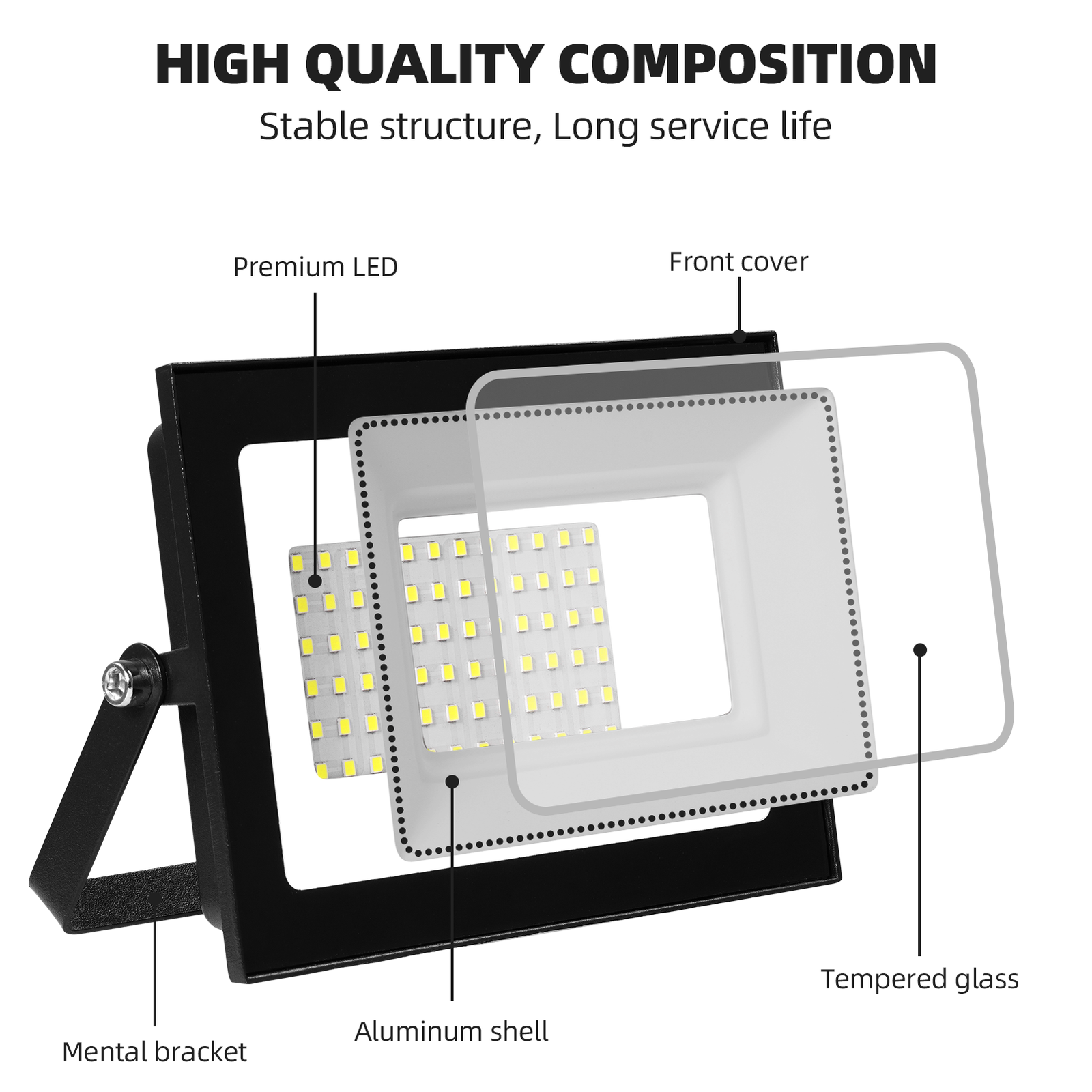 新建网页 2 新建网页 1 新建网页 1 Product Description 新建网页 2 新建网页 1 Features: 1. High lumens without radiation: LED lighting creates healthy life without radiation, flash frequency and flash. It is manufactured with high lumen LED chip, turn-on delay, instant sparkle, 100% brightness. 2. Good heat dissipation performance: The high-efficiency aluminum body is used, which is impact resistant and has good heat dissipation performance, and the new thermal circuit with convection design has good heat dissipation performance, which prolongs the service life of the bulb. 3.120° wider angle beam: LED floodlights provide super bright, shadow-free and wide beam distribution light for general outdoor outdoor floodlights. 4.IP66 waterproof: IP66 rating, which means you don't have to worry about water penetration to get the job done. Note that floodlights cannot be immersed in water. 5. Indoor and outdoor lighting: basketball/football field, garden, courtyard parking lot, hotel, square, landscape. Specification: Power: 50W Color Temperature: Cool White (6000K-6500K) lumens : 100lm/W Size (cm): 17x11.6x2.7cm/6.69*4.56*1.06in Voltage: AC85-265V Impact resistance: IK08 Reflective cup material: Nano refractive index of 95% LED Chip Code:2835SMD Material: Aluminum Waterproof grade: IP66 Beam angle: 120° Operating temperature: -20℃ to +55℃ Life: > 50,000 hours line length:50cm Dimmable: No =