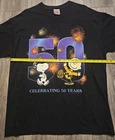 This black XL t-shirt features Snoopy and Charlie Brown from the Peanuts cartoon, celebrating 50 years of the iconic characters. The shirt is made of cotton knit fabric with a solid pattern, short sleeves, and a crew neckline. It has a vintage look with a Peanuts logo accent, making it a nostalgic piece for fans of the 90s cartoon. This regular-fit t-shirt is machine washable and suitable for all seasons, ideal for a casual and comfortable style. ** HAS SMALL HOLE ON THE BACK**