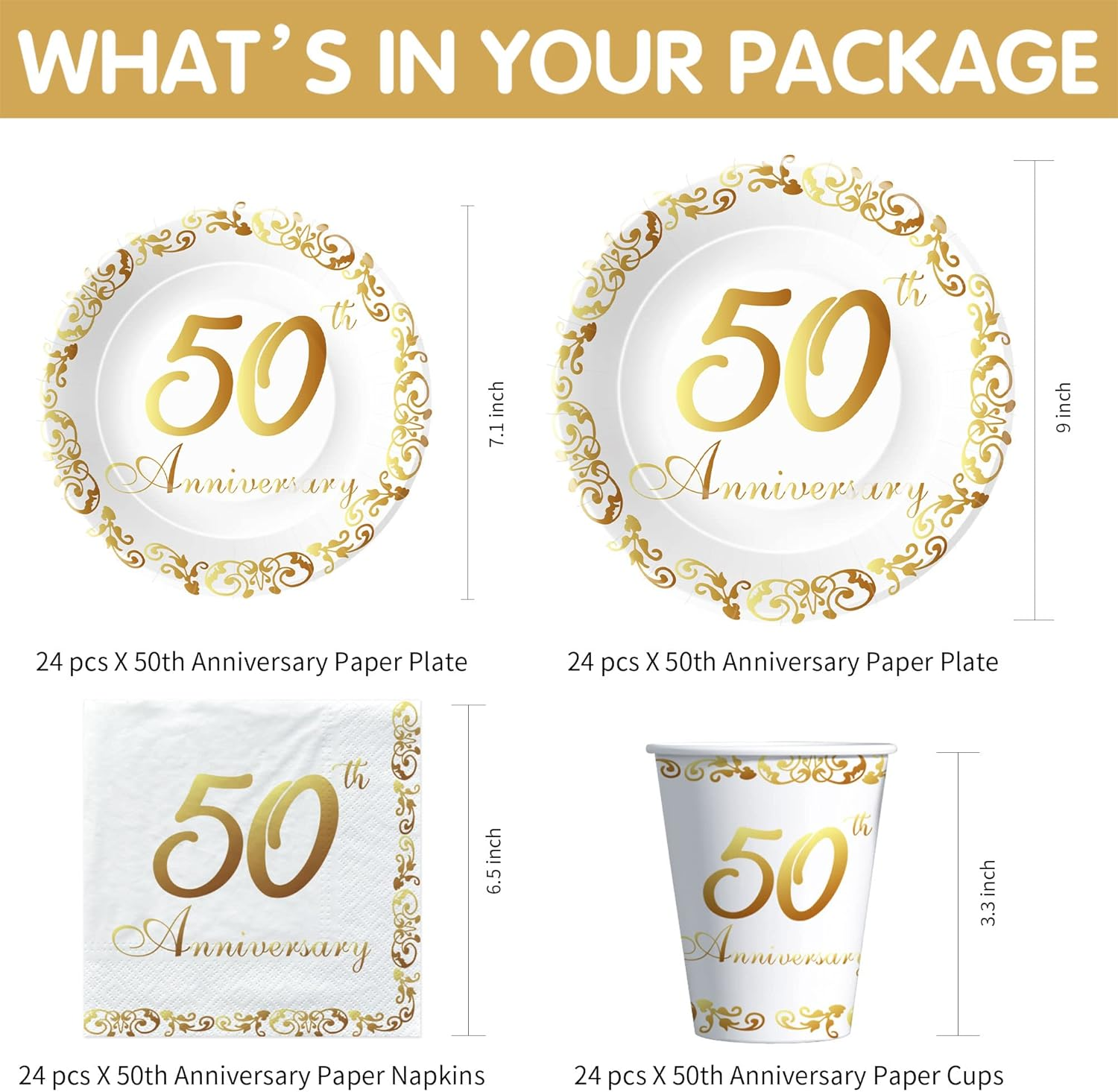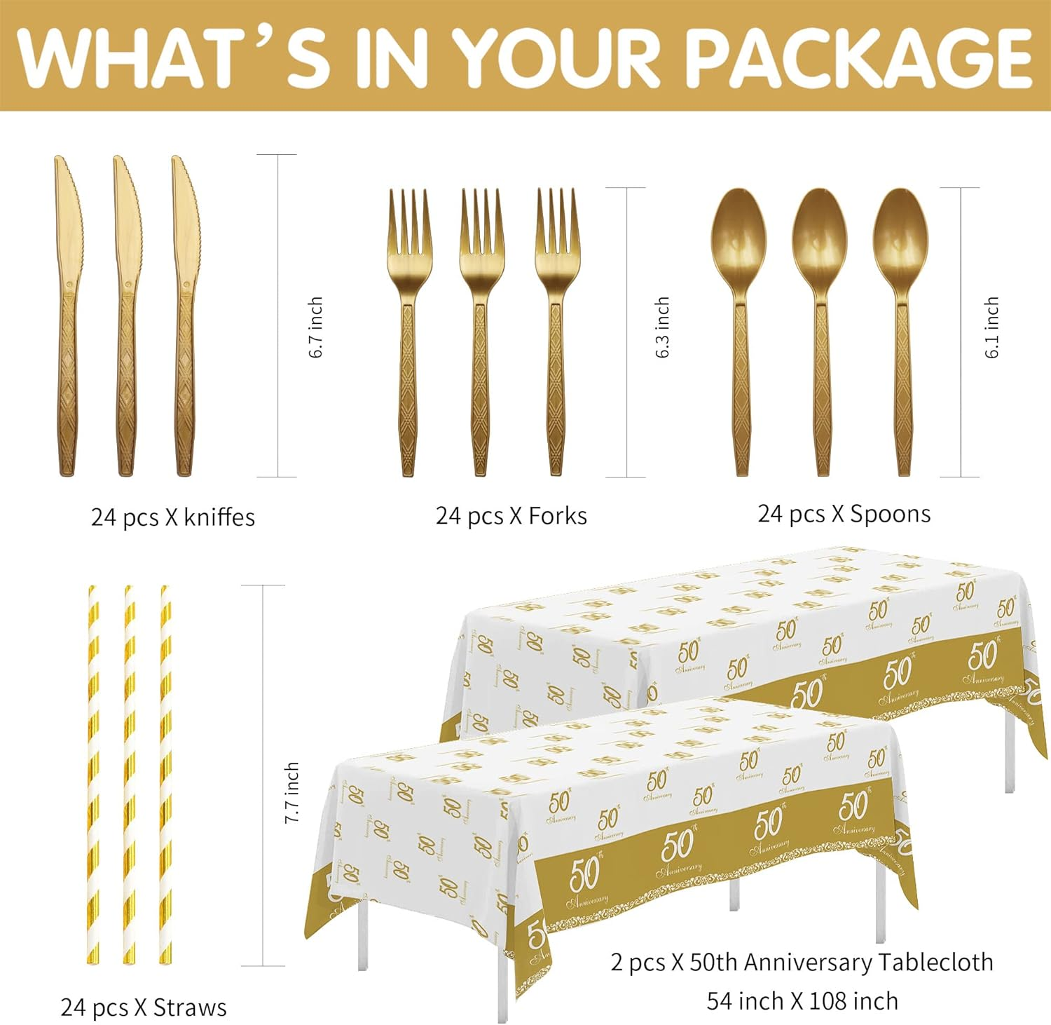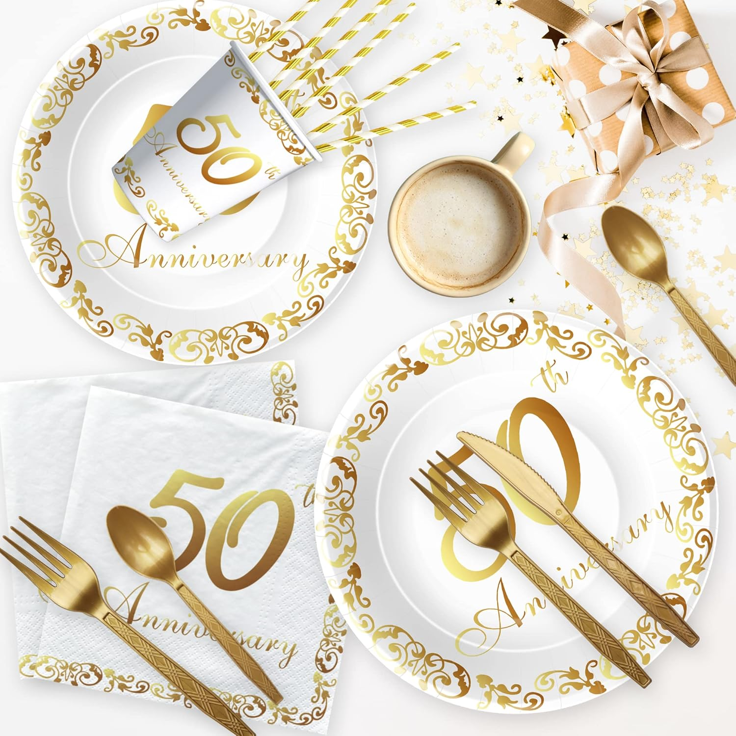【Package Included】Our 50th wedding anniversary plates dinnerware included 24pcs 9'' 50th anniversary dinner plates, 24pcs 7'' 50th dessert plates, 24pcs 50th paper napkins, 24pcs paper cups, 24set cutlery, 24pcs paper straws, 2pcs 50th anniversary tablecloth, for happy 50th wedding decorations party supplies 【50th Anniversary Table Decorations】Happy anniversary! Our 50th-anniversary party decorations dinnerware set is designed in gold color, this wedding anniversary decorations set can completely meet your needs, classic gold colors match perfectly making the party impressed 【Save Time】These happy anniversary decorations for 50th wedding are perfect for your party. The disposable tableware and party tablecloth can save you from the hassle of cleaning after the party, you can enjoy more time with friends and family at this party 【Premium Quality Materials】Crafted from quality materials, these 50th anniversary plates and napkins party supplies are both stylish and reliable. The plates and cups are sturdy enough for meals, while the lightweight design ensures safe and comfortable use 【Versatile & Timeless】50th wedding anniversary party supplies is nice for couples’ milestone anniversaries, vow renewals, or romantic dinner parties. The chic and modern look fits both casual gatherings and formal celebrations Product description