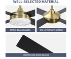 STYLE TREND: The design is to capture the reflection cast by the natural effect of the glasswork as we explore various ripple designs to achieve its final form. The integrated LED light kit provides an efficient light output without sacrificing on style. RIPPLE GLASS SHADE: Built-in 24-watt LED module (not dimmable): 1200 lumen light output, comparable to a 75-watt incandescent. 3000K/4500K/6000K color temperature available. The essence of Ripple Glass Shade derives from the simplicity and elegance of the glasswork. QUIET & REVERSIBLE: A stylish 6-speed Hand-Held Remote Control is included, along with fan-off timers and natural breeze mode. Conveniently quiet, 6 speed - reversible DC motor. Run Summer and Winter to aid in rotating air and cutting down on energy costs. DC MOTOR: Energy efficient, ultra-quiet, six-speed and reversible DC motor with new, reliable technology. The DC ceiling fan provides whisper-quiet cooling while using less power than traditional AC ceiling fans. DIMENSIONS: Measures 12"-19.5'' from the ceiling to the lowest point of the fan with the included 4.5" and 12" down rod. This Sleek Ceiling Fan has a blade sweep diameter of 52'' with 12° Blade Pitch. Dual-mount design for standard or sloped ceiling (max 15°).
