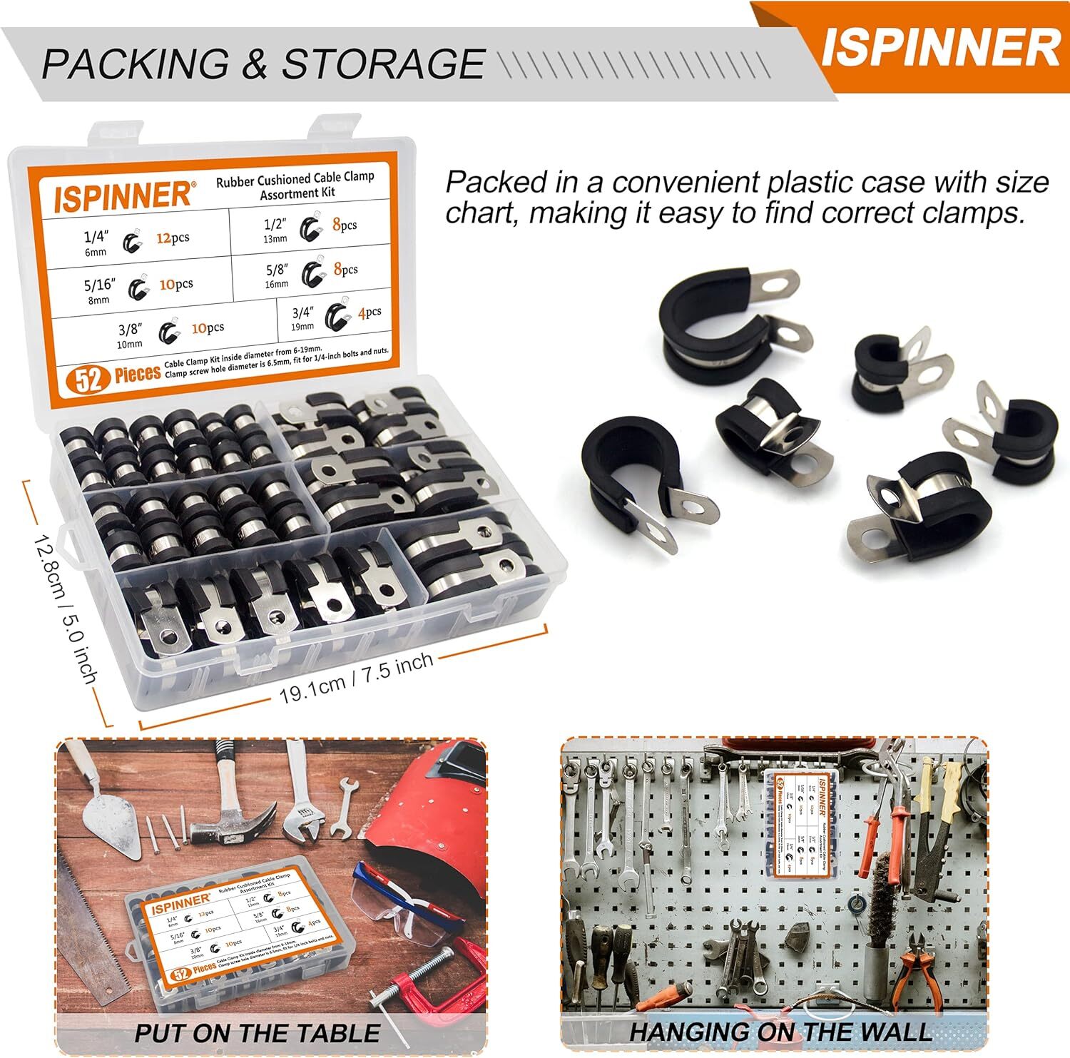 HIGH QUALITY: Made of high-quality rubber cushioned stainless steel, with high performance of corrosion resistance and acid resistance, they are strong and durable. When installed, you will no longer worry about them rusting and breaking. SIZE & QUANTITY: This 52pcs cable clamps assortment kit includes 6 different sizes for you to deal with multiple different situations. It includes 1/4 inch (12pcs), 5/16 inch (10pcs), 3/8 inch (10pcs), 1/2 inch (8pcs), 5/8 inch (8pcs), 3/4 inch (4pcs). UNIQUE DESIGN: The rubber on the clamp can help prevent vibration and impact from clamp edges on the held objects. The width of whole clamp is 19mm, which is wider than most rubber cable clamps on the market. More sturdy to protect the tubes well and hold the pipes firmly in place. EASY TO USE: The installation is easy, just find a correct clamp and put it into wires/pipes, tighten it with M6 screws. Comes with a convenient plastic case with size chart, making it easy to find correct rubber clamps quickly, saves your time of running around looking for a particular size. WIDE APPLICATION: It is very suitable to apply in automotive, industrial, boat/ship, windshield, household and other indoor/outdoor application for wiring, cables, pipes, racks, line management and repair.