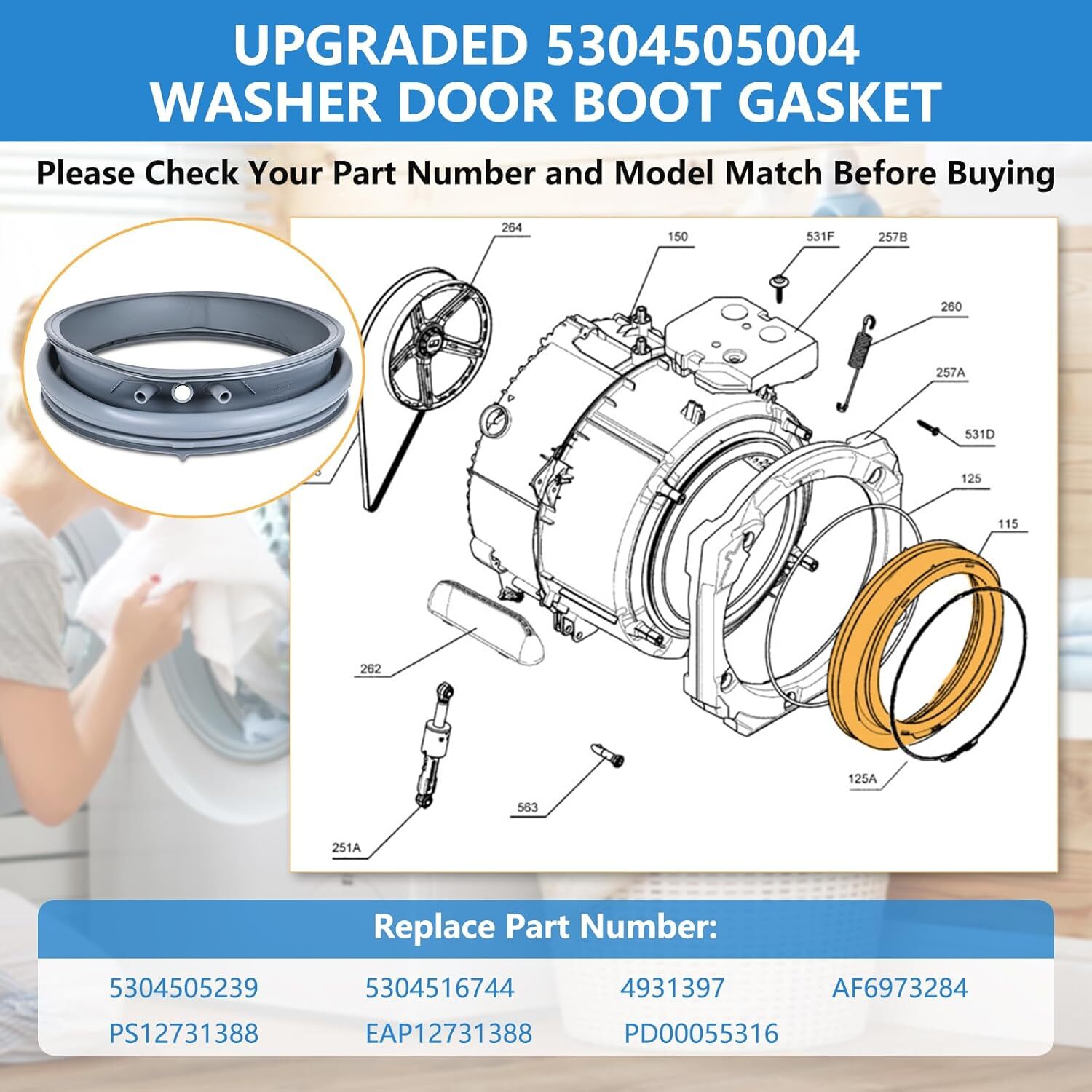 Store New Arrivals Add to Favorite View Feedback Contact 5304505004 Washer Door Gasket for Frigidaire Electrolux Front Load Seal Boot Description Item model number 5304505004 5304516744 5304505239 Part Number 5304505004 Batteries Required? No Product Dimensions 7.84 x 6.29 x 14.17 inches Country of Origin China Warranty Description 2 Year Item Weight 3.98 pounds Included Components 5304505004 5304516744 5304505239 Front Load Washing Machine Door Bellow Boot Gasket Product Specification: Washer door gasket replacement size: Front: 18.9 inches, Back: 16.2 inches. This 5304505004 front load washing machine door bellow boot gasket is compatible with Frigidaire Electrolux Washer Door Seal. The washer door seal has two round positioning pins on the left and right sides of the middle area, a round drainage hole in the center, and a rubber clasp at the bottom. Please verify, based on the detailed information in Figure (2), whether your washer is suitable for our 5304505004 Washer Door Gasket Replacement Washer Door Gasket Replacement Part Number: The 5304505004 front load washing machine door bellow boot gasket replaces the following part numbers: 5304516744 5304505239 4931397 AP6973284 PS12731388 EAP12731388 PD00055316 Washer Door Gasket Fit Models: This washer door seal replacement is compatible with Frigidaire Electrolux washer door seal models, including EFLS527UIW0 EFLS527UIW1 EFLS527UIW2 EFLS527UTT0 EFLS527UTT1 EFLS527UTT2 EFLS627UIW0 EFLS627UIW1 EFLS627UIW2 EFLS627UTT0 EFLS627UTT1 EFLS627UTT2 EFLS628WTT00 ELFW7537AT0 ELFW7537AT1 ELFW7537AW0 ELFW7537AW1 ELFW7637AT0 ELFW7637AT1 ELFW7637AW0 ELFW7637AW1 ELFW7637BT0 ELFW7637BT1 ELFW7637BW0 ELFW7637BW1 ELTE7600AT0 ELTE7600AW0 ELTE760CAT0 ELTE760CAW0 ELTG7600AT0 ELTG7600AW0 EFLS517SIW0 EFLS517STT0 EFLS617SIW0 EFLS617STT0 ELTE7600AT ELTG7600AW ELTG7600AT Easliy install: If your washing machine experiences the following problems: Mold buildup in the door seal, Damaged door seals, Persistent odors, Unusual noises, or Splashing during operation, you can use our 5304505004 front load washing machine door bellow boot gasket to address these issues. Installation is straightforward and quick. Before replacing the Washer Door Seal, be sure to disconnect the power supply, disassemble the top and front control panels to access the washer seal, disconnect the old seal, and clean the rim thoroughly. Install our 5304505004 washer door boot seal gasket, then gradually reassemble the removed parts Assured product: The package includes a 5304505004 Front Load Washing Machine Door Bellow Boot Gasket Replacement . If you have any questions about washer door gasket, our customer service team can help you within 12 hours. We have a professional team, you are entitled to a product Service lasting 2 years. Your positive experience is what keeps us going Product Description 5304505004 Front Load Washing Machine Door Bellow Boot Gasket Replacement Compatible with Frigidaire Electrolux Washer Door Seal Our 5304505004 gasket seals are quick and easy to install. Please follow the installation steps in the pictures for DIY installation. If your washer is experiencing the problem pictured, you can purchase our 5304505004 Washer Seal to solve the problem. 5304505004 washer door gasket is made of high-quality rubber, with strong flexibility, excellent waterproof performance, no odor, and a long service. The 5304505004 washer door gasket seal has a drain port for water drainage, with the drain hole located at the 6 o'clock position. It has been tested for outstanding corrosion resistance, excellent oxidation resistance, and a long service life, meeting or exceeding OEM standards. Washer door gasket size: Front: 18.9 inches, Back: 16.2 inches. This MDS47123604 washer door gasket is compatible with Frigidaire Electrolux Washer. Compatible with Frigidaire/Electrolux Please use Ctrl+F in the Menu Compatible with FElectrolux EFLS517SIW0 EFLS517STT0 EFLS617SIW0 EFLS617STT0 ELTE7600AT ELTG7600AW ELTG7600AT Compatible with Frigidaire EFLS527UIW0 EFLS527UIW1 EFLS527UIW2 EFLS527UTT0 EFLS527UTT1 EFLS527UTT2 EFLS627UIW0 EFLS627UIW1 EFLS627UIW2 EFLS627UTT0 Compatible with Frigidaire EFLS627UTT1 EFLS627UTT2 EFLS628WTT00 ELFW7537AT0 ELFW7537AT1 ELFW7537AW0 ELFW7537AW1 ELFW7637AT0 ELFW7637AT1 ELFW7637AW0 Compatible with Frigidaire ELFW7637AW1 ELFW7637BT0 ELFW7637BT1 ELFW7637BW0 ELFW7637BW1 ELTE7600AT0 ELTE7600AW0 ELTE760CAT0 ELTE760CAW0 ELTG7600AT0 ELTG7600AW0 ABOUT US We offer the best prices around on high quality products. Our E-store includes media such as books, movies, music and games while offering electronics, toys, sporting apparel, clothing, tools, general home, garden items and more. SHIPPING We are always working hard to ensure your package arrives as soon as possible. Please understand that some factors like weather, high postal traffic, and the performance of shipping companies are outside of our control. RETURNS We offer a 30-Day Return Policy on items which you are not completely satisfied with. You have the option for a full-refund or an exchange of the item. PAYMENT We accept PayPal. CONTACT US This page content is yet to come Please ad us to your favorite seller and visit again later Thank You CUSTOMER SATISFACTION We try our very best to make sure every customer is completely satisfied. If there's a problem, message us! We're happy to help.