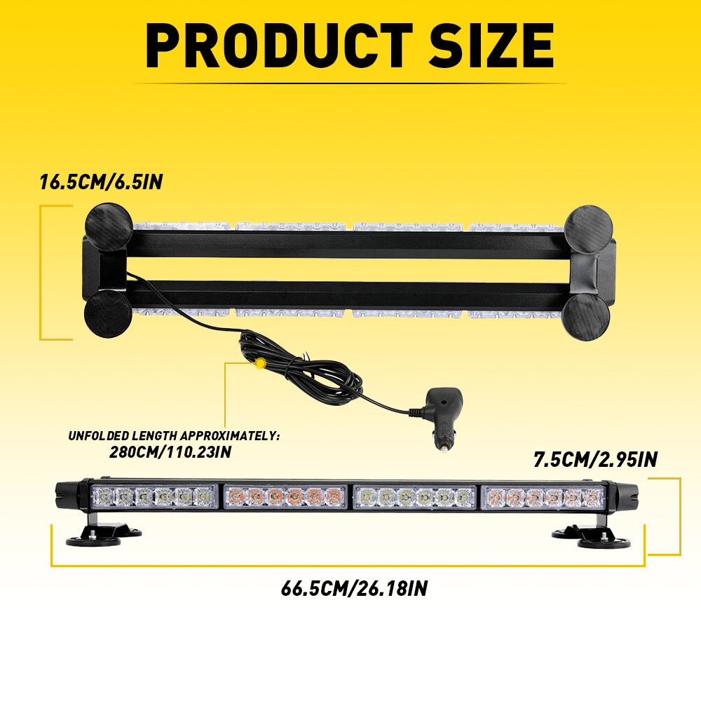 Strobe Light Bar For Trucks,26.5" Emergency Warning Strobe Lights For Vehicles Fits for: Universal compatibility for all vehicles equipped with 12 volt DC cigarette adapter Specifications: Length:26.5 inch LED quantity:54 LED Waterproof:IP67 Mode:White/amber(flashing) Service life:50000h+ Features: Professional design The 26.5-inch emergency warning LED strobe light with sleek and low-key design can be fully sealed to provide adequate protection against the wind and rain. It fits for plain-clothes man,firefighters, construction workers to use. 360°super bright 2Set 54 LED Emergency Light Bar Rooftop Double Side Strobe Warning Light Amber/W Strobe Light Bar For Trucks,26.5" Emergency Warning Strobe Lights For Vehicles Fits for: Universal compatibility for all vehicles equipped with 12 volt DC cigarette adapter Specifications: Length:26.5 inch LED quantity:54 LED Waterproof:IP67 Mode:White/amber(flashing) Service life:50000h+ Features: Professional design The 26.5-inch emergency warning LED strobe light with sleek and low-key design can be fully sealed to provide adequate protection against the wind and rain. It fits for plain-clothes man,firefighters, construction workers to use. 360°super bright Our emergency lights is designed with 54 high intensity LEDs, which will offers a super bright light output not only in daytime but also in midnight,raning or fog days.Double-sided design with LED lights embedded on the left and right sides,strobe light bar offers you all-round coverage viewing angle, improve the driver security and avoid accidents. Waterproof desing Strobe light adopts upgraded waterproof enclosure design,which has better safety than the non-waterproof design on the market and effectively improves the performance. 15 flashing modes There are 15 flashing modes for you , including Rotating, Flashing, Alternating Left to Right, Right to Left, Traffic Advisor, etc... You can switch ON/OFF or select the flashing mode conveniently at the cigarette lighter plug buttons. Last used pattern recall/memory function. Packaging include: 1X Strobe Light unit What makes you choose our products? Rapid logistics and response: We will dispatch your order within one work day since your payment to guarantee that you can receive your order immediately. High quality: The raw materials are strictly inspected high-quality ones. In addition, our inspectors will inspect all the products again before they are dispatched to guarantee all customers receive good products. Guaranteed after sales service: We provide quality guarantee services 2 year. Any customer can contact us for any problem during the period. We provide after sales services within one work day. High cost performance: Providing products with high cost performance is our lasting objective. Our products may not be the cheapest or expensive ones, but they must be the ones with the optimal cost performance. In general, you can enjoy reliable quality, speedy service along with competitive price. Your satisfaction is my goal.My customer service is not only the guarantee of money, but also the guarantee for your time and expectation. Item Specifics Interchange Part Number 1 emergency traffic light,Strobe light bar Beacon lights Brand AUXITO Manufacturer Warranty 1Year MPN Does Not Apply Voltage 12V Fitment Type direct replacement Lighting Technology LED Suitable For Accessory Light Combination Light Emergency Light Lumens 5000 lm Material ABS LED Bulb Type LED Color Temperature 6000k Light Color Amber/White Placement on Vehicle Front, Left, Rear, Right, Roof, Upper Wattage 16W LED Quantity 54LEDs per Light Wire Black is the negative pole, red is the positive pole Bulb Life Hours Up to 30,000 Hours Type LED Strip Shape Strip Housing Color Black Features Durable Item Length 26.5 inch Modes White/amber(flashing); 15 flashing modes Waterproof grade IP67 Universal Fitment Yes Model all vehicles equipped with 12 volt DC cigarette adapter To Fit Indicator Features 1 Durable, Dustproof, Easy Installation, High Brightness, Items Included Bracket, Cigarette Lighter Plug, Switch, Magnetic Bases Country/Region of Manufacture Emergency Strobe Light, Warning Light, Hazard Lights Interchange Part Number Snow Plow Light, Flashing Light, Safety Light Superseded Part Number Dash Warning Light, Strobe Lights for Trucks FAQ ♥ If you have a decoding problem or any other problems, please contact us first, we will help you with it. We will reply you within 24 hours in working days. I'm a new seller, thanks a lot for your trust and convince! I will serve you with all my heart. ♥ Q1: Will this bulb fit my vehicle? A: We can match almost any vehicle to one of our bulb sizes. eBay only lets us include some vehicle fitments per listing, but if your vehicle does not show up on the compatibility table at the top of our listings, welcome you to contact us for free consulation before purchasing a product. Q2: My item has not arrived, what's taking so long? A: Sometimes items take longer than expected, especially if it’s going far or to rural area. Check with your post office to see if your item has been held up. Sometimes Royal Mail will not update a tracking number until it has arrived at its destination. If your item still don't arrive after a few days, let us know so we can double check for you and help solve it asap. Q3: My bulbs won't fit, help! A: Special bulb holder may be required. See if you can take the holder from the stock bulb. If not, let us know. The bulb size may be wrong, double check the item you received with the item you ordered. Do you have an aftermarket lighting housing? These may not be perfectly fitted for aftermarket bulbs and will require some manual modifications. Q4: Neither side lighting up? Both sides flicker, hyper flash, or work inconsistantly. A:Check the light fuses, and then check the ballast plugs to insure correct installation. If this doesn't work, there may be a voltage problem with the vehicle. You probably just need a relay or capa