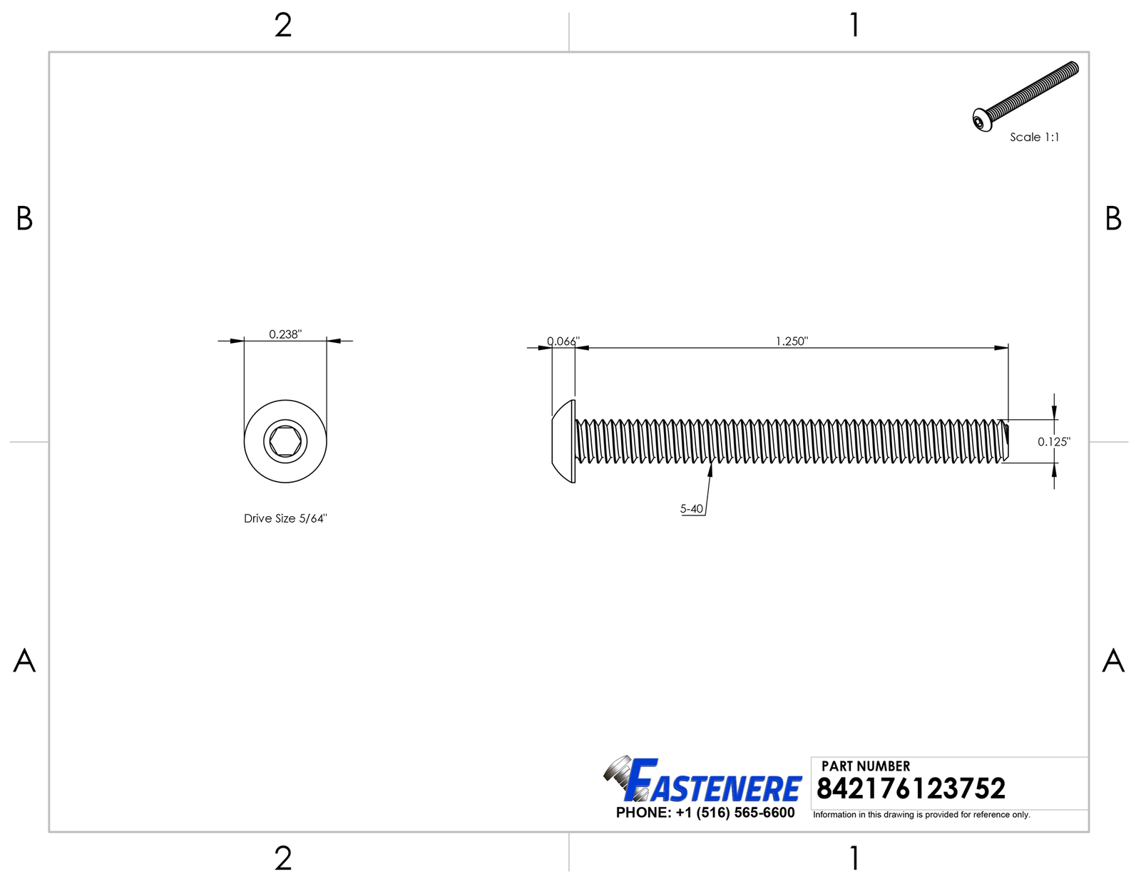 5-40 x 1-1/4" Button Head Socket Cap Screws Black Oxide Alloy Steel Qty 1000 General Product Information Head Style : Button Drive Style : Allen Hex Key Drive Size : 5/64" Thread : 5-40 Length : 1-1/4" Quantity of Fasteners in Package : 1000 Material Type : Alloy Steel Grade Rating : 8 Detailed Product Information: Head Diameter : Head Height : 0.066" Thread Diameter : 0.125" Threads Per Inch (TPI) : 40 Coarse or Fine Thread : Coarse Thread Coverage : Full Thread Thread Length : 1.25 Key Notes: Button socket cap screws have a wide bearing surface and high tensile strength but are low profile allowing for clearance in tight spaces where there is not sufficient space for wrenches or sockets button head cap screw is recommended for lighter fastening operations and is not suggested for use in critical high strength applications where socket head cap screws should normally be used Black oxide is not a coating but a surface chemical conversion process that offers a mild corrosion resistance Fastenere black oxide button head socket cap screws are treated with a heavy water displacing oil that coats the fastener offering a greater level of corrosion resistance than most other black oxide fasteners These button cap screws are a grade 8 equivalent offering a high tensile and yield strength These fasteners have a machined thread pattern of 5-40 which is apart of the unified thread system Shipping: All orders placed before 3:30 pm EST Will Ship Same Day Tracking is provided on ALL Orders Priority Mail Shipping service is offered at a discount of only $3.95 UPS Ground UPS Next Day Air is available, Please inquire for pricing Returns : ALL returns are accepted if returned within 60 days. Money Back or exchange guaranteed. NO Restocking Fees. For YOU, we constantly strive to find ways of improving our performance.