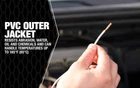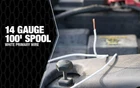 Product Description Product Description 100'; white; 14 gauge; primary wire; durable PVC outer jacket resists water; & chemicals; full gauge; stranded copper for higher current carrying capacity; use for headlight circuits; cigar lighter to switch; gas gauge; to coil; radio to fuse lock; vehicle electrical systems at nominal voltage of 60DC V; 25AC V; or less; SAE standards; rohs Compliant; spool. From the Manufacturer Coleman Cable 14-100-17 14 Gauge; 100-Feet Primary Wire; White This wire is engineered to handle the harsh environment of an automobile engine; the durable PVC outer-jacket resists water; oil; chemicals and abrasion. You can use it on your boat; for audio wires and your car. From the Manufacturer Coleman Cable 14-100-17 14 Gauge, 100-Feet Primary Wire, White This wire is engineered to handle the harsh environment of an automobile engine, the durable PVC outer-jacket resists water, oil, chemicals and abrasion. You can use it on your boat, for audio wires and your car. 100-Feet of single strand primary wire Pvc outer-jacket resists water; oil; chemicals and abrasion Suitable for projects on cars; trucks; boats Handy spool size is convenient for many different projects