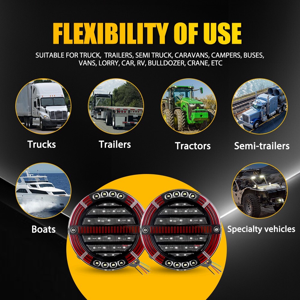 Fit for: Suitable for truck, trailers, semi truck, caravans, campers, buses, vans, lorry, car, rv, bulldozer, crane, etc. Specifications: Product Material: ABS+PC Light Color: Amber+white+red Voltage: 12-24V Wiring Method: Black wire: Negative pole Red wire: High-light red Green wire: Low-light red Blue wire: White light Yellow wire: Turning flowing amber Waterproof Grade: IP67 Lifespan: 50,000h+ Functions: Tail Light, Stop Brake Light, DRL, Turn Signal Flowing, etc Features: *High Brightness Each LED tail light is bright enough and energy-saving. *Superior Quality 5.5'' Round LED Bus Truck Turn Signal Running Light Tail Brake DRL Trailer Stop Fit for: Suitable for truck, trailers, semi truck, caravans, campers, buses, vans, lorry, car, rv, bulldozer, crane, etc. Specifications: Product Material: ABS+PC Light Color: Amber+white+red Voltage: 12-24V Wiring Method: Black wire: Negative pole Red wire: High-light red Green wire: Low-light red Blue wire: White light Yellow wire: Turning flowing amber Waterproof Grade: IP67 Lifespan: 50,000h+ Functions: Tail Light, Stop Brake Light, DRL, Turn Signal Flowing, etc Features: *High Brightness Each LED tail light is bright enough and energy-saving. *Superior Quality Made of high-quality material to ensure its low energy consumption, good waterproof and shock resistance. *Waterproof The tail light has an IP67 waterproof rate, which works even under extreme conditions such as rain and snow. *Wide Application This pair of LED tail lights can be used in any vehicle with 12V-24V, such as truck, trailers, semi truck, caravans, campers, buses, vans, lorry, car, rv, bulldozer, crane, etc. *Warm Notice Please check the detailed information of the product carefully before purchasing. Packaging Include: 2x 5.5" Round LED Tail Light Item Specifics Brand : Unbranded Type : Tail Light Assembly Manufacturer Warranty : 1 Years Product Material : ABS,PC Features 1 : High Brightness Features 2 : Superior Quality Features 3 : Waterproof Features 4 : Wide Application Placement on Vehicle : Front left, front right Number of Pieces : 2 Country/Region of Manufacture : China Light Color : Amber,white,red Voltage : 12-24V Black wire : Negative pole Red wire : High-light red Green wire : Low-light red Blue wire : White light Yellow wire : Turning flowing amber Waterproof Grade : IP67 Lifespan : 50,000h+ Functions : Tail Light, Stop Brake Light, DRL, Turn Signal Flowing, etc Packaging Include : 2x 5.5" Round LED Tail Light Payment (1) Instant PayPal payment is the preferred method of payment. (2) We also accept payment via PayPal, DebitCard, Visa, MasterCard, Discover. (3) We will only ship to the confirmed PayPal shipping address given with the payment. (4) If you want to ship to other address, please change your PayPal shipping address before you make payment. (5) To avoid initiating an unpaid item claim, please pay within 7 days. Shipping (1) We will ship your item(s) within 24 hours. (2) We ship this item to US usually via USPS first class mail. It usually takes 3-6 working days to deliver. Returns (1) We offer free return & money back guarantee. If you are not satisfied with your purchase for any reasons, you can return the item for refund or replacement/exchange. All returns must include the original packaging. (Please refer to our return policy for details.) (2) If you don't return goods within 60 days from date of purchase, your right to cancel will be revoked. Any items damaged because of incorrect installation will not be refunded. Please contact us for return or troubleshooting help prior to returning any products. (3) Unauthorized reselling of AUXITO products is strictly prohibited and we can't honor the warranty if purchasing from the unauthorized reseller. Contact Us [Our office hours are MONDAY - Saturday 9:00PM - 6:00PM PST, but we will response you once we get your message .There will be some delay on respons if you send message or E-Mail on Sundy.] (1).Negative feedback will not help resolve any problems you have, please contact us via eBay messages before leaving negative feedback, our customer service will make best effort to help you with the issues. (2).We maintain high standards of excellenceand strive for 100% customer satisfaction! Feedback is very important to us. We request that you contact us immediately BEFORE you give us neutral or negative feedback, so that we can satisfactorily address your concerns. FAQ Why swith to LED? LEDs not only give your vehicle a clean, modern look but, with proper use, will outlast any halogen bulb and HID bulb! Low energy draw, high lumen output, and instant on/off LED technology out shines stock bulbs in every way. Which bulbs are used in my vehicle? Check Sylvania automotive lamp replacemnt guide, you can select the year, make, and model of your vehicle, then select the application you want to replace or upgrade from stock. What does CAN Bus mean? CAN Bus means Controller Area Network Bus. This system monitors your vehicle and reports operating conditions. CAN Bus systems are commonly found in European vehicles such as BMW, Audi, Mercedes, Volkswagen, Porsche, and in many American vehicles. While most late model American vehicles have CAN Bus systems, it is always good to check with your vehicle dealer to see which system your vehicle has before purchasing electrical products. When do you need Warning Canceller? Some vehicles with cmplex internal computers(such as Audi,BMW,Jaguar,Mercedes,etc.) might report on-dash errors or flickering on the headlights. The warning canceller fixes the dashboard warning and flickering effect. Bulb Out Dashboard Error: On some vehicles, the dashboard will report as if you have a headlight bulb missing or burnt. It does not affect the headlights functioning, but the light on-dash will be on. The warning canceller fixes the issue. Flickering Issue: This happens when your vehicle does not recognize the new headlights installed. When turning the headlights on, the vehicle's computer doe