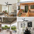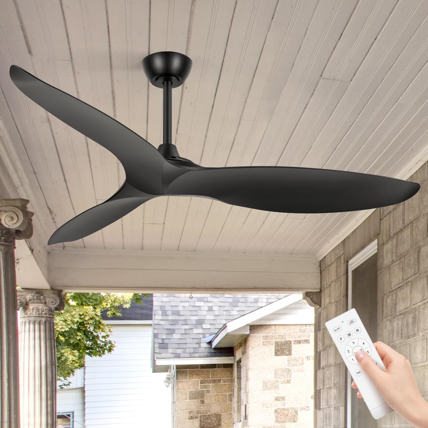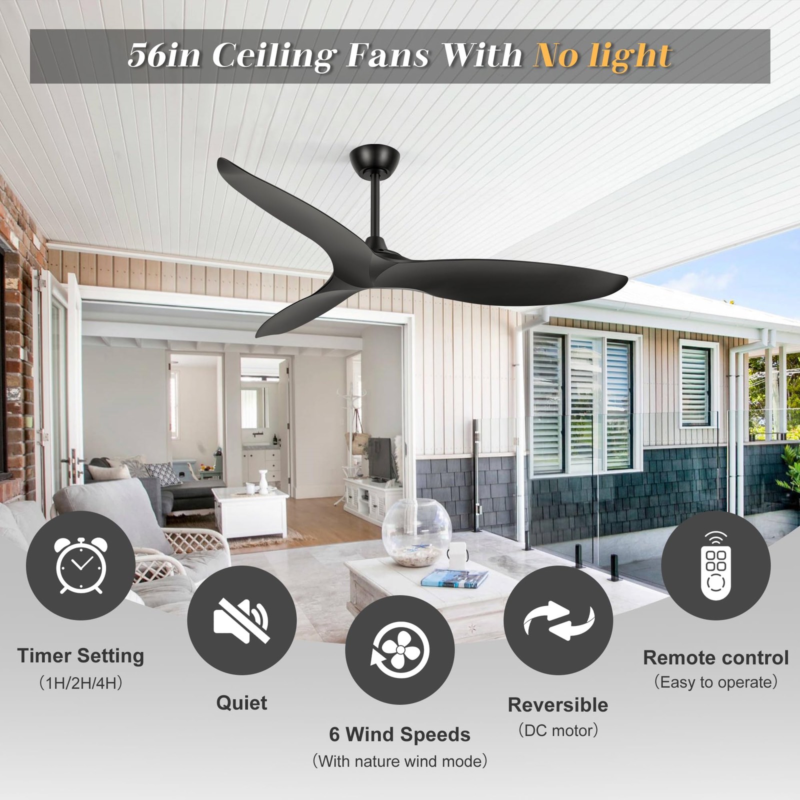 56-Inch Farmhouse Ceiling Fans with No Lights Remote Control, 3-Blade, Reversible DC Motor, 6-Speed, Timer Function, Down Rod Mount Product Features: Fan Type: Down Rod Mount Ceiling Fan Style: Industrial/Modern/Farmhouse Material: Metal, ABS Body Color: Black Number of Blades: 3 Blade Size: 17.7"L x 5"W Material of Blades: ABS Blade Colors: Black Blade Pitch: 13 degree Lighting: No Light Motor Type: DC motor Reversible Motor: Yes Motor Voltage: 120V/50-60HZ Motor Watts: 30W Speed: 6-Speed Max Motor Speeds: 170 RPM Max CFM: 4800 Down Rod Size Choice: 5"/10" Diameter of the Down Rod: 26.5mm/1 Inch Sloped Ceiling Compatible: Yes. ≤15° Low Noise: Yes Airflow Efficiency: 216 【56-Inch Ceiling Fans without Light】This 56" modern ceiling fan no light designed with black color and 2 down rods(5", 10"), it will suitable for a variety of interior decoration styles and ceilings of different heights. You can choose the most suitable downrod size according to your room style. You can also use it at outdoor, garden, patio, porch and more. 【Powelful and Quiet DC Motor】This 56" farmhouse ceiling fans with no lights designed with powerful DC motor, including 6 speeds and it will meet your different needs to the wind(Strong-Weak), you can use it to cooling and air circulation,not just for summer. And more, The quiet motor make this bedroom ceiling fan working well and there is no noise to bother you guys, just enjoy the comfortable wind! 【Indoor/Outdoor Ceiling Fans Remote Control】The portable remote control makes controlling the fan more flexible and convenient. You can adjust the fan speeds, timing setting(1/2/4 H), and direction of rotation. The package comes with a remote control holder, which you can fix on the bedside or other convenient places to fix and store your remote control. 【High Performance Large Ceiling Fan】With 3 black ABS blades and powerful dc motor, the ceiling fan without light offers a morden and elegant style and more pweroful wind than other ceiling fan. Ideal for bedroom, living room, dining room, garage, barn, or covered patio. It is also perfect for indoor and outdoor decoration design, not just for home, but also for commercial using: classroom, meeting room, restaurant and more. 【Easy to Install & After Sales Service】Some assemble is required for this home kitchen low profile modern ceiling fan. Please feel free to contact us if you have any questions about this product. You will receive 1 x 56 inch 3 blades ceiling fan, 1 x remote control, 2 x downrod and 1 x user manual.