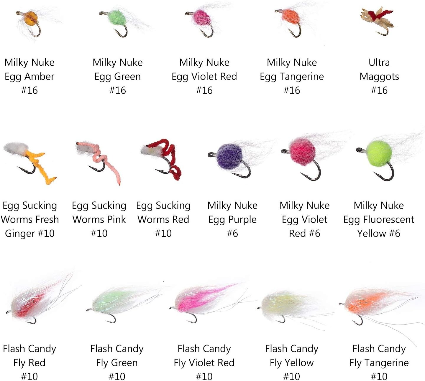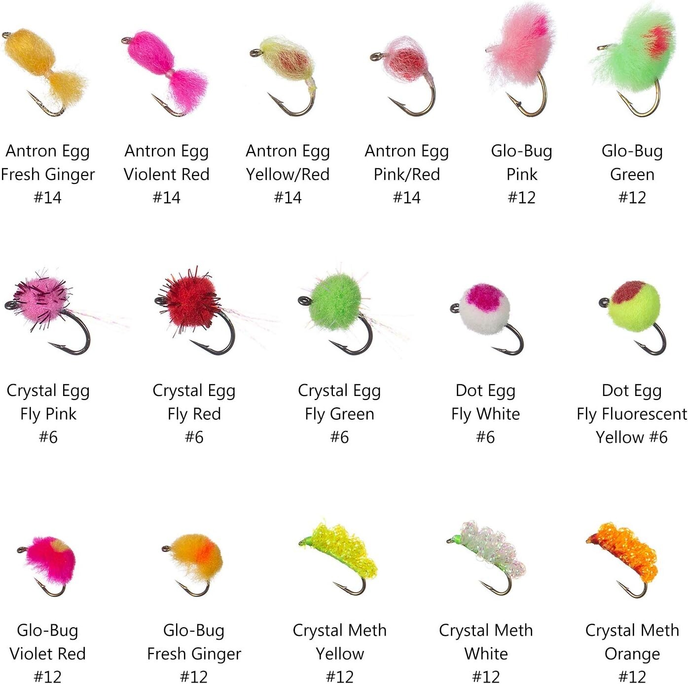 Una práctica combinación para pescadores con mosca, especialmente para aquellos que pescan trucha arcoíris y salmón. Contiene 32 patrones de moscas reales, los más populares y confiables para la pesca de trucha arcoíris, salmón y trucha. Importado. Las 57 moscas en 32 patrones de esta colección son algunas de las más realistas del mercado, e incluyen: Antron Egg, Glo-Bug, Crystal Egg Fly, Dot Egg Fly, Crystal Meth, Milky Nuke Egg, Ultra Maggots, Egg Sucking Worms y Flash Candy Fly. Consulte las imágenes para ver los patrones detallados y los tamaños de anzuelo correspondientes. Cada mosca está atada según rigurosos estándares en anzuelos de alto carbono, afilados químicamente. Este kit de moscas viene listo y cargado en una caja de moscas de doble cara de alta calidad. Las moscas incluidas en este kit son perfectas para la pesca de trucha arcoíris, salmón y trucha.