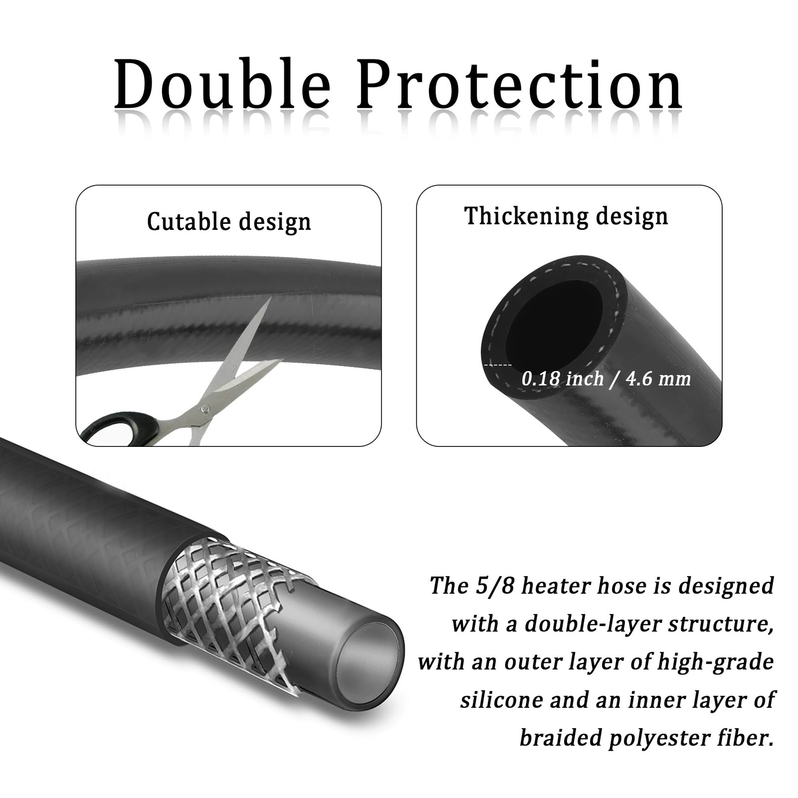 9.84 Ft 5/8 Heater Hose,ID16mm OD24mm 5/8 Silicone Heater Hose for Water/Air/Coolant Transportation,Durable 5/8 Coolant Hose Car Accessories Withstands Burst Pressure 246psi Important Size: Package contains 1 pc of 5/8 silicone heater hose length: 9.84 ft/118.11 in, thickness: 0.18 in/4.6 mm, ID: 0.62 inch (5/8“) / 16 mm, OD: 0.94 inch (15/16”) / 24 mm. Measure the ID and OD of the hose you need before ordering Product Parameters: This 5/8 coolant hose meets the requirements of standard SAE 20R3 Class A. It has a working pressure of 60 psi, a burst pressure of 246 psi, a temperature range of -50°C to 200°C, and a minimum bending radius of 80 mm Good Sealing: Just the right amount of flexibility and thickness! This silicone heater hose seals well can effectively prevent any type of coolant leakage and avoid damage to your car engine. It is also easy to cut for your different usage needs 5/8 SILICONE HEATER HOSE FOR YOU TO EASILY TRANSPORT AIR, WATER, EFFICIENT WORK Product Parameters Working Pressure: 60psi Burst Pressure: 246psi Temperature Range: -50°C - 200°C Minimum Bend Radius: 80 mm Product Attributes Colors: Black Sizes: - Length: 9.84 ft / 118.11 inch - Thickness: 0.18 inch / 4.6 mm - Inner Diameter: 0.62 inch (5/8") / 16 mm - Outside diameter: 0.94 inch (15/16") / 24 mm Weight: 34.7 oz Material: Silicone Packaging: 1x 5/8" Silicone Heater Hose Product Feature & Functions 1. The outer silicone material has excellent heat resistance, heater core hose can withstand high temperature heater coolant without deformation and aging. At the same time, silicone also has excellent cold resistance properties, in the cold winter can also maintain good flexibility, will not crack because of low temperature. The braided structure also increases the strength and durability of the hose, extending its service life. 2. This silicone heater hoses has a thick side wall, but it is highly flexible and can be bent and cut freely, allowing you to easily find the right length for a tight connection. This heater core hoses are explicitly not suitable for transporting diesel/gasoline/fuel, as the oil will significantly shorten the service life Shipping We offer FREE shipping on all orders! We ship within Three business days of payment, usually sooner. We use a selection of shipping services such as UPS, FedEx, USPS etc. We only ship to the lower 48 states, no APO/FPO addresses or PO Boxes allowed. Local pickups and combined shipping options are not provided at this time. Return You can return a product for up to 30 days from the date you purchased it. Any product you return must be in the same condition you received it and in the original packaging. Please keep the receipt. Payment We accept payment by any of the following methods: PayPal Please pay as soon as possible after winning an auction, as that will allow us to post your item to you sooner! Feedback Customer satisfaction is very important to us. If you have any problem with your order, please contact us and we will do our best to make you satisfied. Contact Us If you have any queries, please contact us via ebay. We usually respond within 24 hours on weekdays. Please visit our eBay store to check out other items for sale! Thank you for shopping at our store.